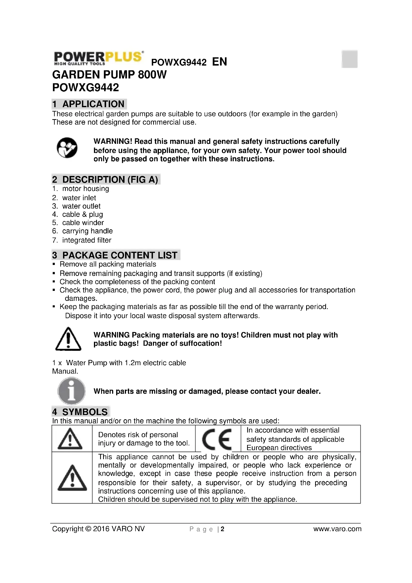 POWXG9442 1 APPLICATION These electrical garden pumps are suitable to use outdoors (for example in the garden) These are not designed for commercial use. WARNING! Read this manual and general safety instructions carefully before using the appliance, for your own safety. Your power tool should only be passed on together with these instructions. 2 DESCRIPTION (FIG A)
