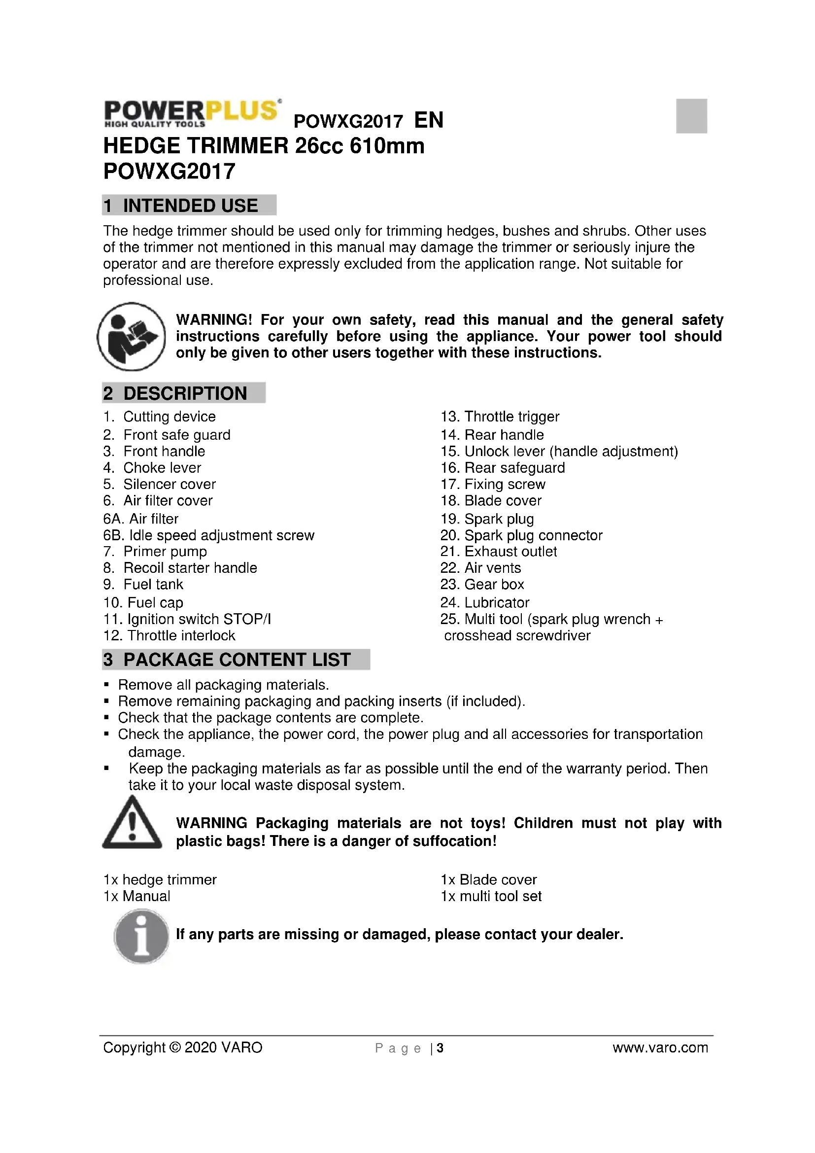 - Keep the packaging materials as far as possible until the end of the warranty period. Then take it to your local waste disposal system. WARNING Packaging materials are not toys! Children must not play with plastic bags! There is a danger of suffocation! 1x hedge trimmer 1x Manual 1x Blade cover 1x multi tool set If any parts are missing or damaged, please contact your dealer.POWXG2017 EN Copyright © 2021 VARO P a g e | 4 www.varo.com 4 SYMBOLS The following symbols are used in this manual and/or on the machine: