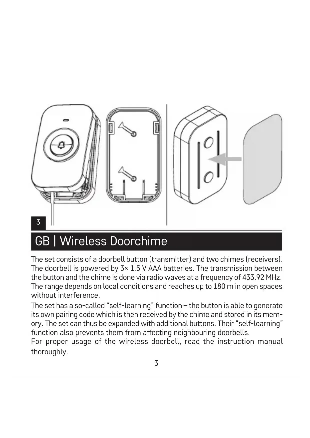 GB | Wireless Doorchime The set consists of a doorbell button (transmitter) and two chimes (receivers). The doorbell is powered by 3× 1.5 V AAA batteries. The transmission between the button and the chime is done via radio waves at a frequency of 433.92 MHz. The range depends on local conditions and reaches up to 180 m in open spaces without interference. The set has a so-called “self-learning” function – the button is able to generate its own pairing code which is then received by the chime and stored in its mem- ory. The set can thus be expanded with additional buttons. Their “self-learning” function also prevents them from aecting neighbouring doorbells. For proper usage of the wireless doorbell, read the instruction manual thoroughly.4 Specications Transmission range: up to 180 m in an open area (can drop down to one fth in a busy area) Transmission frequency: 433.92 MHz, 10 mW e.r.p. max. Button: water resistant; enclosure rating IP56 Pairing of chime with buttons: self-learning function Pairing capacity: maximum of 6 buttons (replacement button P5728T) Number of ringtones: 52 Chime power supply: 3× 1.5 V batteries (type AAA) Button power supply: 1× 12 V battery (type A23) Includes: double-sided adhesive tape Chime Description (see Fig. 1) 1 – bell LED 2 – battery compartment 3 – holes for hanging 4 – speaker 5 – ringtone change button 6 – pairing/volume setting button Button Description (see Fig. 2) 1 – ring button 2 – button LED 3 – hole for opening the battery cover 4 – battery compartment Button Installation (see Fig. 3) Pairing the Button with the Chime