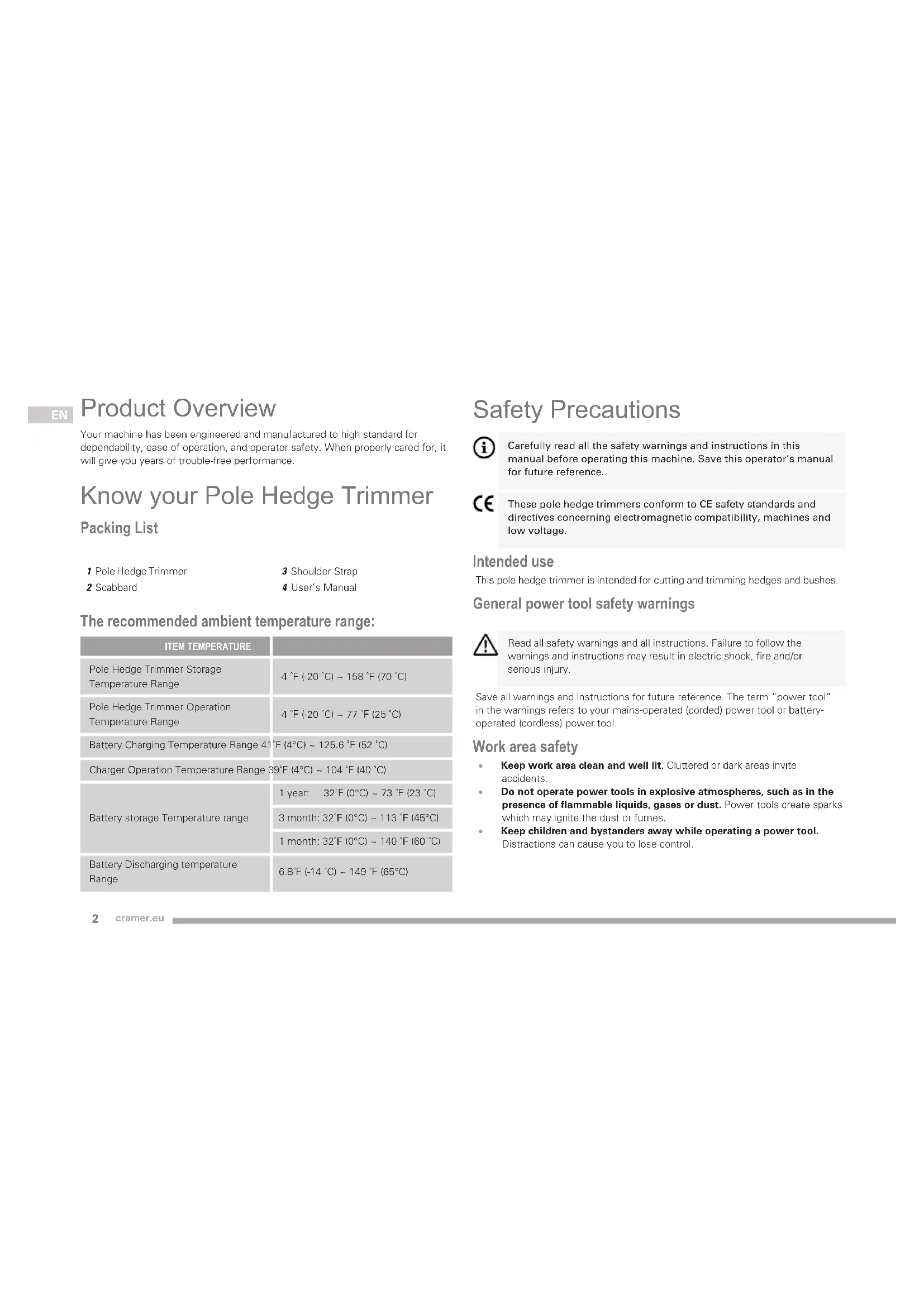 - Keep all nuts, bolts and screws tight to be sure the equipment is in safe working condition. • Check regularly that the handles are fixed firmly. Store the Machine Review the ’The Recommended Ambient Temperature Range’ chart for informaiton on storage temperature.When the machine is to be stored away:1 Remove the battery from its housing and recharge it;2 Mount the blade cover.3 Wait until the motor is sufficiently cold;4 Clean.5 Check there are no loose or damaged components. If necessary, replace the damaged components and tighten any screws and loose bolts or contact the authorised service centre.6 Store the machine: – in a dry place – protected from inclement weather – in a place where children cannot get to it – making sure that keys or tools used for maintenance are removed.8 cramer.eu