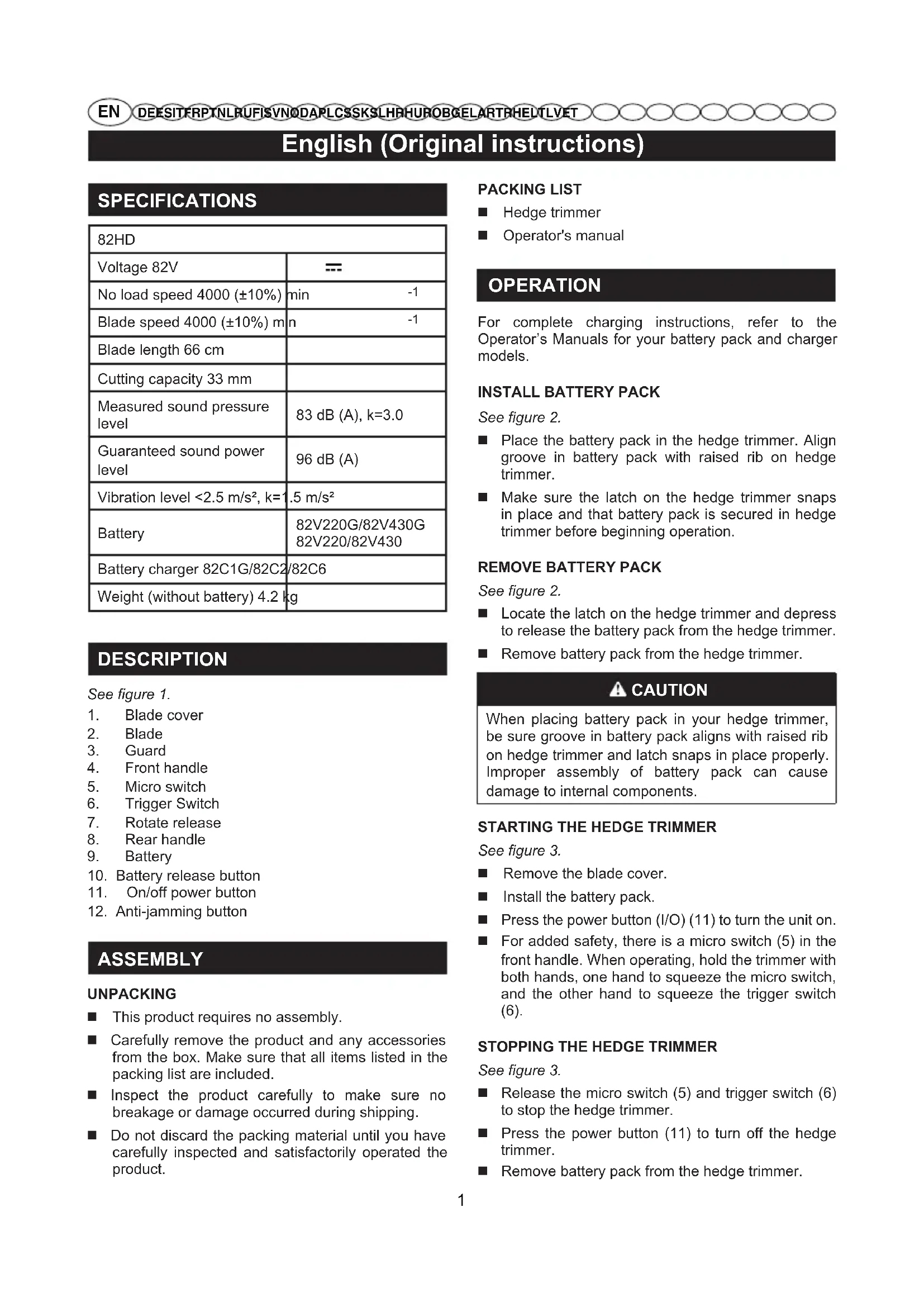 Blade length 66 cm Cutting capacity 33 mm Measured sound pressure level 83 dB (A), k=3.0 Guaranteed sound power level 96 dB (A) Vibration level <2.5 m/s², k=1.5 m/s² Battery 82V220G/82V430G 82V220/82V430 Battery charger 82C1G/82C2/82C6 Weight (without battery) 4.2 kg DESCRIPTION See figure 1.