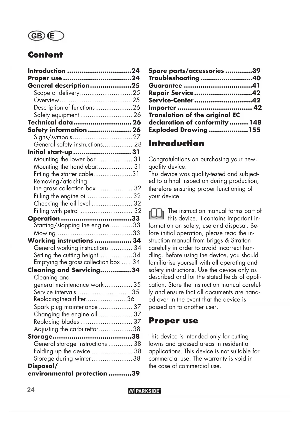 - Exploded Drawing Introduction Congratulations on purchasing your new, quality device. This device was quality-tested and subject- ed to a nal inspection during production, therefore ensuring proper functioning of your device The instruction manual forms part of this device. It contains important in- formation on safety, use and disposal. Be- fore initial operation, please read the in- struction manual from Briggs & Stratton carefully in order to avoid incorrect han- dling. Before using the device, you should familiarise yourself with all operating and safety instructions. Use the device only as described and for the stated elds of appli- cation. Store the instruction manual careful- ly and ensure that all documents are hand- ed over in the event that the device is passed on to another user. Proper use This device is intended only for cutting lawns and grassed areas in residential applications. This device is not suitable for commercial use. The warranty is void in the case of commercial use.25 IEGB Any other use that is not expressly permit- ted in this instruction manual may result in damage to the device and pose a serious hazard to the user. The device is intended for use by adults. Children and people who are not familiar with this instruction manual must not use the device. The operator or user is responsible for any accidents or personal injury and/or material damage to third parties or their property. General description An illustration of the most im- portant functional components can be found on the front and the back fold-out pages. Scope of delivery Carefully remove the device from the packaging and check whether all the parts listed below are present and complete: - Petrol lawnmower - Lower bar - Mounting accessories for the handlebar - Grass collection box - Cable clamp - Spare spark plug - Spark plug wrench - Quick guide - Instruction manual - Instruction manual from Briggs & Stratton Overview 1 Handlebar 2 Safety bracket 3 Bowden cable 4 Lower bar 5 Mounting accessories, handlebar 5a Washer 5b Quick release levers 5c Screw 6 Cable clamp 7 2 quick release levers 8 Engine cover with ventilation holes (nger protection) 9 Tank cap 10 Air lter box 11 Air lter (not visible) 12 Spark plug connector 13 Spark plug (not visible) 14 2 front wheels 15 Sheet plate housing 16 Exhaust guard 17 Lever for setting the cutting height 18 2 rear wheels 19 Oil tank cap with dipstick 20 Rear impact protection 21 Grass collection box 22 Grass collection box carrying handle 22a Bottom handle, grass collection box 23 Fill level indicator 24 Starter handle with starter cable 25 Starter cable guide 26 Spare spark plug 27 Spark plug wrench 28 Grass collection box attachment 29 Filler plugs 30 Petrol pump (primer) 31 Cutting height position 32 Blade 33 Blade bolt 34 Engine spindle 35 Clamping disk26 GB IE Description of functions The device is powered by a powerful 4-stroke engine (Briggs & Stratton 125 cc series). The device is equipped with a high quality steel plate housing, a grass collection box and a foldable grip handle. Please refer to the descriptions below for information on how the operating elements work. Safety equipment 2 Safety bracket The device stops when the safety brack- et is released. 16 Exhaust guard Prevents hands or ammable materials from coming into contact with the hot exhaust. 20 Rear impact protection Protects the operator from ejected parts and against unintended contact with the blade when mowing without the grass collection box. Technical data Petrol lawn mower p. 155