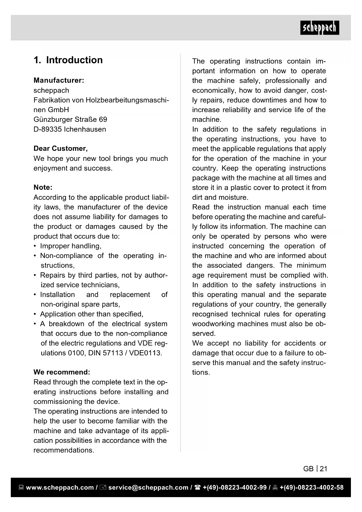 Manufacturer: scheppach Fabrikation von Holzbearbeitungsmaschi- nen GmbH Günzburger Straße 69 D-89335 Ichenhausen Dear Customer, We hope your new tool brings you much enjoyment and success. Note: According to the applicable product liabil- ity laws, the manufacturer of the device does not assume liability for damages to the product or damages caused by the product that occurs due to:
