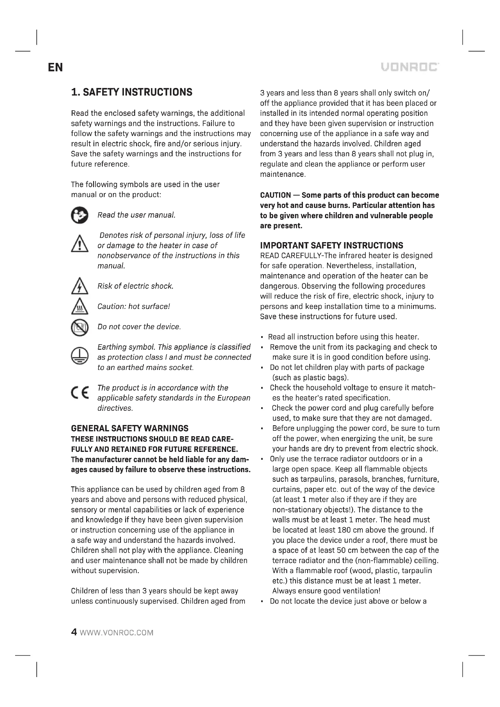 Read the enclosed safety warnings, the additional safety warnings and the instructions. Failure to follow the safety warnings and the instructions may result in electric shock, fire and/or serious injury. Save the safety warnings and the instructions for future reference. The following symbols are used in the user manual or on the product: Read the user manual. Denotes risk of personal injury, loss of life or damage to the heater in case of nonobservance of the instructions in this manual. Risk of electric shock. Caution: hot surface! Do not cover the device. Earthing symbol. This appliance is classified as protection class I and must be connected to an earthed mains socket. The product is in accordance with the applicable safety standards in the European directives.