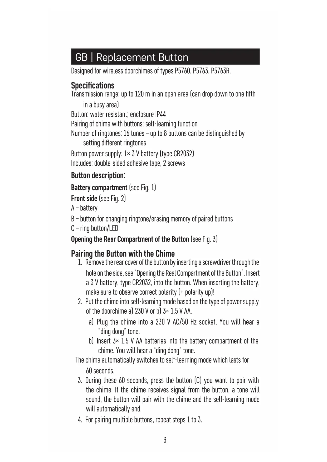 GB | Replacement Button Designed for wireless doorchimes of types P5760, P5763, P5763R. Specications Transmission range: up to 120 m in an open area (can drop down to one fth in a busy area) Button: water resistant; enclosure IP44 Pairing of chime with buttons: self-learning function Number of ringtones: 16 tunes – up to 8 buttons can be distinguished by setting dierent ringtones Button power supply: 1× 3 V battery (type CR2032) Includes: double-sided adhesive tape, 2 screws Button description: Battery compartment (see Fig. 1) Front side (see Fig. 2) A – battery B – button for changing ringtone/erasing memory of paired buttons C – ring button/LED Opening the Rear Compartment of the Button (see Fig. 3) Pairing the Button with the Chime