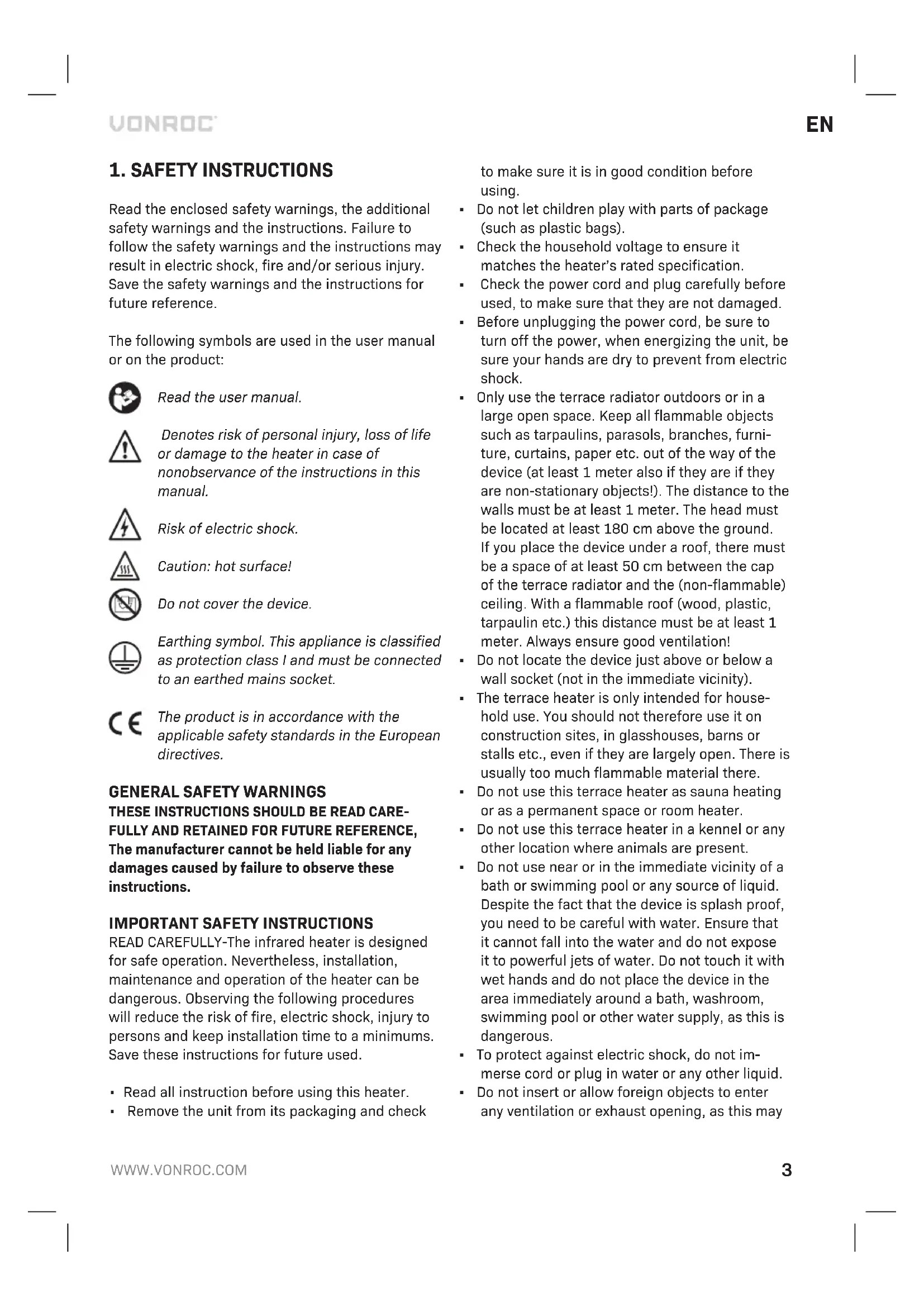Read the enclosed safety warnings, the additional safety warnings and the instructions. Failure to follow the safety warnings and the instructions may result in electric shock, fire and/or serious injury. Save the safety warnings and the instructions for future reference. The following symbols are used in the user manual or on the product: Read the user manual. Denotes risk of personal injury, loss of life or damage to the heater in case of nonobservance of the instructions in this manual. Risk of electric shock. Caution: hot surface! Do not cover the device. Earthing symbol. This appliance is classified as protection class I and must be connected to an earthed mains socket. The product is in accordance with the applicable safety standards in the European directives.