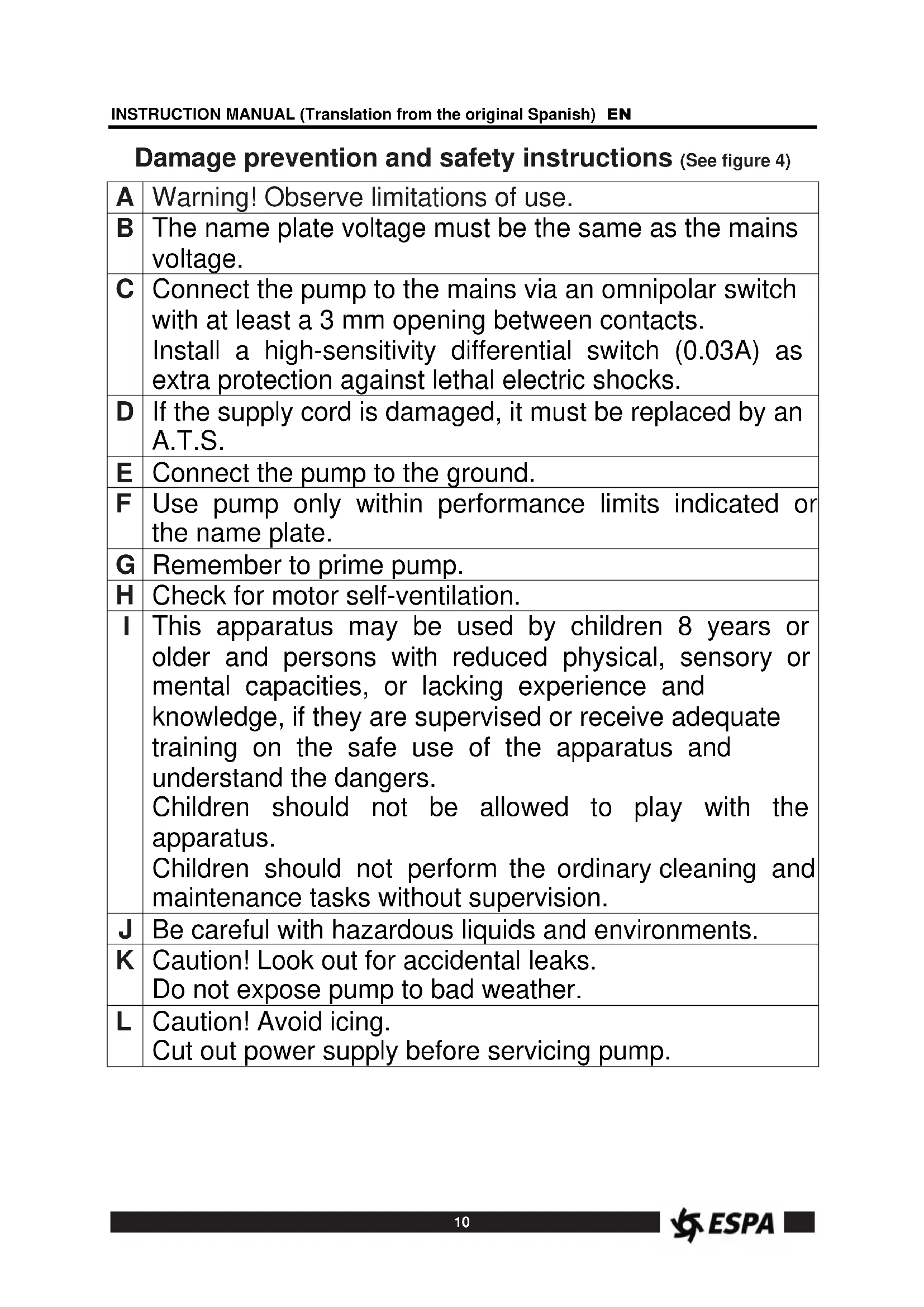 Please observe the following instructions to achieve the best pump performance possible and a trouble free installation. Read these instructions before installing the pump. Save them for future reference. These are vertical multistage centrifugal pumps having more than one impeller assembled in-line. The same flow passes through each impeller but the pressure increases each time, i.e. more impellers, more pressure. These pumps are designed to operate with clean water, free from particles in suspension and with a maximum temperature of 40 ºC. Correct pump operation is assured providing the instructions on electrical connection, installation and use are strictly adhered to. Failure to adhere to the instructions can result in premature failure of the pump and voiding of the warranty. Minimum efficiency index With the application of the European Regulation 547/2012, the minimum efficiency index after 01/01/2015 must be MEI ≥ 0.40. The reference value for the most efficient hydraulic pumps is rated at MEI ≥ 0.70. The performance curves and efficiency charac- teristics can be checked on the technical cata- logues and on www.espa.com. The operation of this hydraulic pump with variable operating points can be cheaper and more efficient when controlled with, for example, a speed regula- tion control that adjusts the pump's operation to the system performance. The efficiency reference criteria can be found on the following link: http://global.espa.com/doc-descarrega-1/fingerprints.pdf