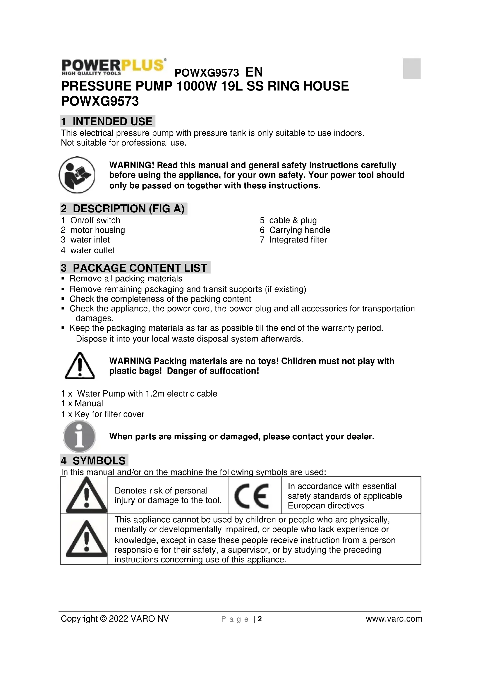 VARO N.V. - Vic. Van Rompuy N.V. Joseph Van Instraat 9 - BE2500 Lier - BELGIUM, declares that, Product: Pressure Pump 1000W 19l SS Ring House Trade mark: POWERplus Model: POWXG9573 is in conformity with the essential requirements and other relevant provisions of the applicable European Directives, based on the application of European harmonized standards. Any unauthorized modification of the apparatus voids this declaration. European Directives (including, if applicable, their amendments up to the date of signature); 2011/65/EU 2014/35/EU 2014/30/EU 2014/68/EU 2000/14/EC Annex V LwA Measured 82dB(A) Guaranteed 84dB(A) European harmonized standards (including, if applicable, their amendments up to the date of signature); EN60335-1 : 2012 EN60335-2-41 : 2003