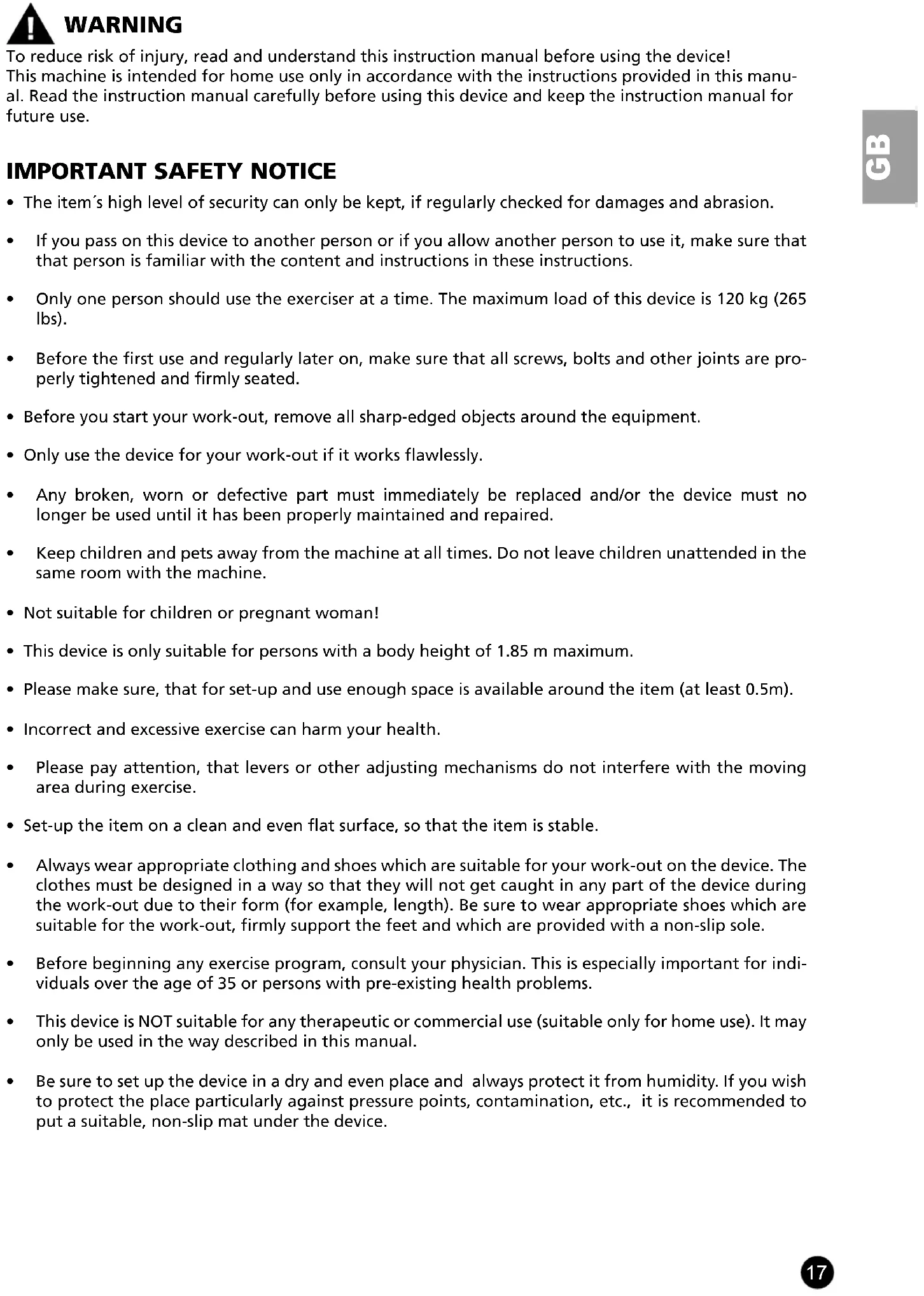 - Only one person should use the exerciser at a time. The maximum load of this device is 120 kg (265 lbs).