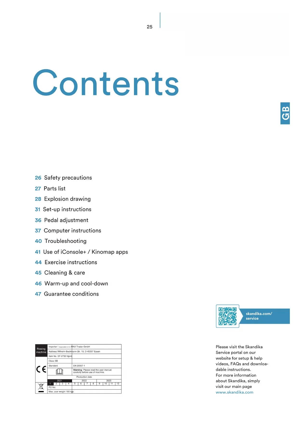 gyms, rehabilitation centers and hotels. Even if most of our units are suitable for a professional use, this requires a separate agreement. In accordance with our policy of continual product impro- vement, we reserve the right to make technical and visual changes without notice. For spare parts please contact: service@skandika.de Service centre: MAX Trader GmbH, Wilhelm-Beckmann-Straße 19, 45307 Essen, Germany ENVIRONMENTAL PROTECTION The symbol of the crossed-out dustbin on batteries or accumulators indicates that they must not be disposed of in household waste at the end of their life. If batteries or accumulators contain mercury (Hg), cadmium (Cd) or lead (Pb), you will nd the respective chemical symbol below the symbol of the crossed-out dustbin. You are legally obliged to return old batteries and accumulators after use. You can do this free of charge at a retail outlet or at another collection point near you. You can obtain addresses of suitable collection points from your city or local government. Batteries may contain substances that are harmful to the environment and human health. Parti- cular care should be taken when handling batteries containing lithium because of the special risks involved. The separate collection and recycling of old batteries and accumulators is intended to avoid negative impacts on the environment and human health. Please avoid the generation of waste from old batteries as far as possible, e.g. by giving preference to batte- ries with a longer life or rechargeable batteries. Please avoid littering public spaces by not carelessly leaving batteries or electrical and electronic equipment containing batteries. Please consider ways to reuse a battery instead of disposing of it, for example by reconditioning or repairing the battery.48 49 Informations de sécurité 50 Liste des pièces 51 Vue explosée 54 Instructions de montage 59 Réglage de la pédale 60 Mode d‘emploi de l‘ordinateur 63 Dépannage 64 Utilisation des applications iConsole+ / Kinomap 67 Instructions d’entraînement 68 Nettoyage et entretien 69 Échauement et récupération 70 Conditions de garantie skandika.com/ service Contenu Vous pouvez trouver les vidéos de montage et de démontage ainsi que la FAQ et les instructions de téléchargement sur notre page de service Skandika. Pour plus d‘informations, vous pouvez simplement visiter notre site web www.skandika.com Rowing machineImporter / responsible in EU MAX Trader GmbHAddress Wilhelm-Beckmann-Str. 19, D-45307 EssenItem No. SF-2730 NjordClass SBStandard EN 20957-1Warning: Please read the user manualcarefully before use of machine.Production date2021 2022 2023 PO No:Max. user weight 180 kgs49