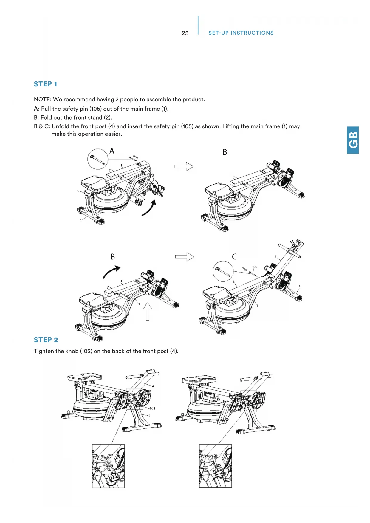 SET-UP INSTRUCTIONS STEP 1 NOTE: We recommend having 2 people to assemble the product. A: Pull the safety pin (105) out of the main frame (1). B: Fold out the front stand (2). B & C: Unfold the front post (4) and insert the safety pin (105) as shown. Lifting the main frame (1) may make this operation easier. STEP 2 Tighten the knob (102) on the back of the front post (4).
