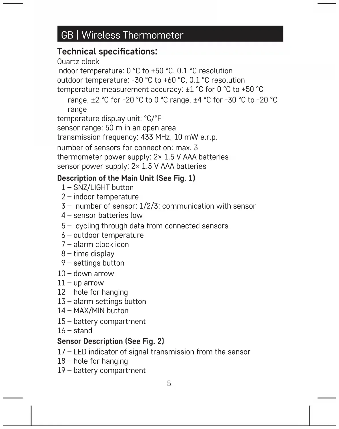 GB | Wireless Thermometer Technical specications: Quartz clock indoor temperature: 0°C to +50°C, 0.1°C resolution outdoor temperature: -30°C to +60°C, 0.1°C resolution temperature measurement accuracy: ±1°C for 0°C to +50°C range, ±2°C for -20°C to 0°C range, ±4°C for -30°C to -20°C range temperature display unit: °C/°F sensor range: 50 m in an open area transmission frequency: 433 MHz, 10 mW e.r.p. number of sensors for connection: max. 3 thermometer power supply: 2× 1.5 V AAA batteries sensor power supply: 2× 1.5 V AAA batteries Description of the Main Unit (See Fig. 1) 1 – SNZ/LIGHT button 2 – indoor temperature 3 – number of sensor: 1/2/3; communication with sensor 4 – sensor batteries low 5 – cycling through data from connected sensors 6 – outdoor temperature 7 – alarm clock icon 8 – time display 9 – settings button 10 – down arrow 11 – up arrow 12 – hole for hanging 13 – alarm settings button 14 – MAX/MIN button 15 – battery compartment 16 – stand Sensor Description (See Fig. 2) 17 – LED indicator of signal transmission from the sensor 18 – hole for hanging 19 – battery compartment6 20 – sensor channel number 1/2/3 setting 21 – RESET button Getting Started