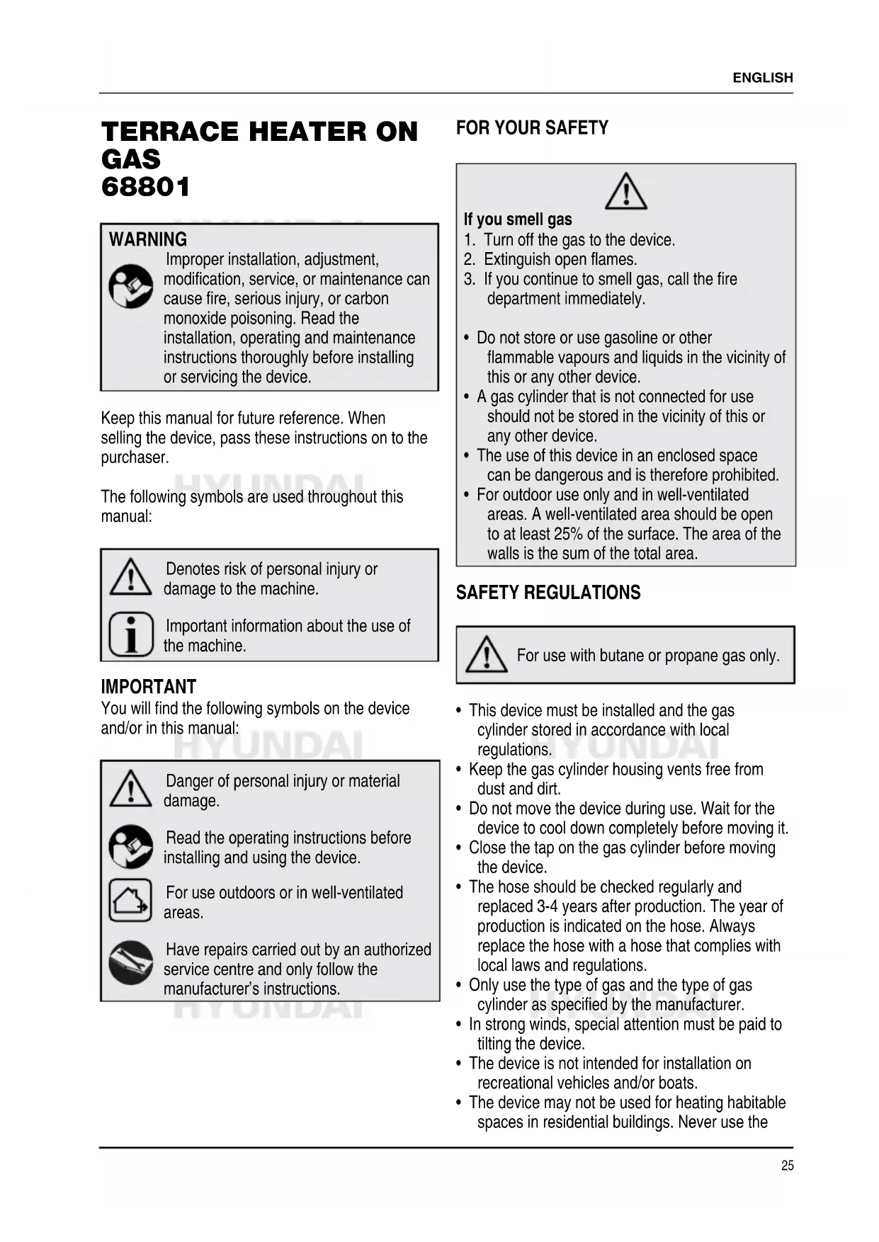 - Never connect a non-compliant gas cylinder to the terrace heater! The pressure regulator and hose to be used must comply with local regulations. Gas Because gas is odourless, an odorant is added to quickly detect a gas leak. Gas is heavier than air; so, try to detect the scent just above the ground! If you smell gas, take immediate action!