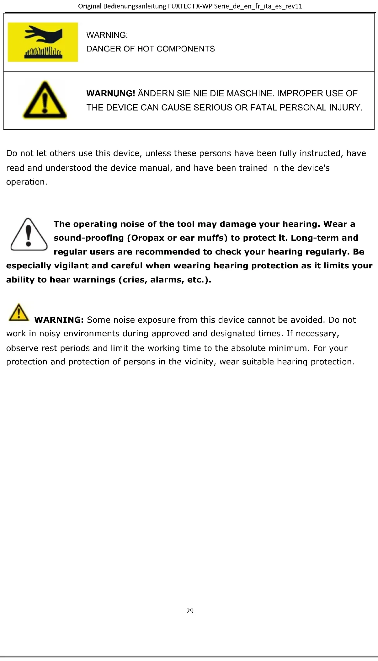 work in noisy environments during approved and designated times. If necessary, observe rest periods and limit the working time to the absolute minimum. For your protection and protection of persons in the vicinity, wear suitable hearing protection.Original Bedienungsanleitung FUXTEC FX-WP Serie_de_en_fr_ita_es_rev11