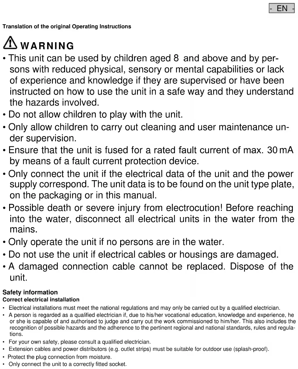 - Possible death or severe injury from electrocution! Before reaching into the water, disconnect all electrical units in the water from the mains.