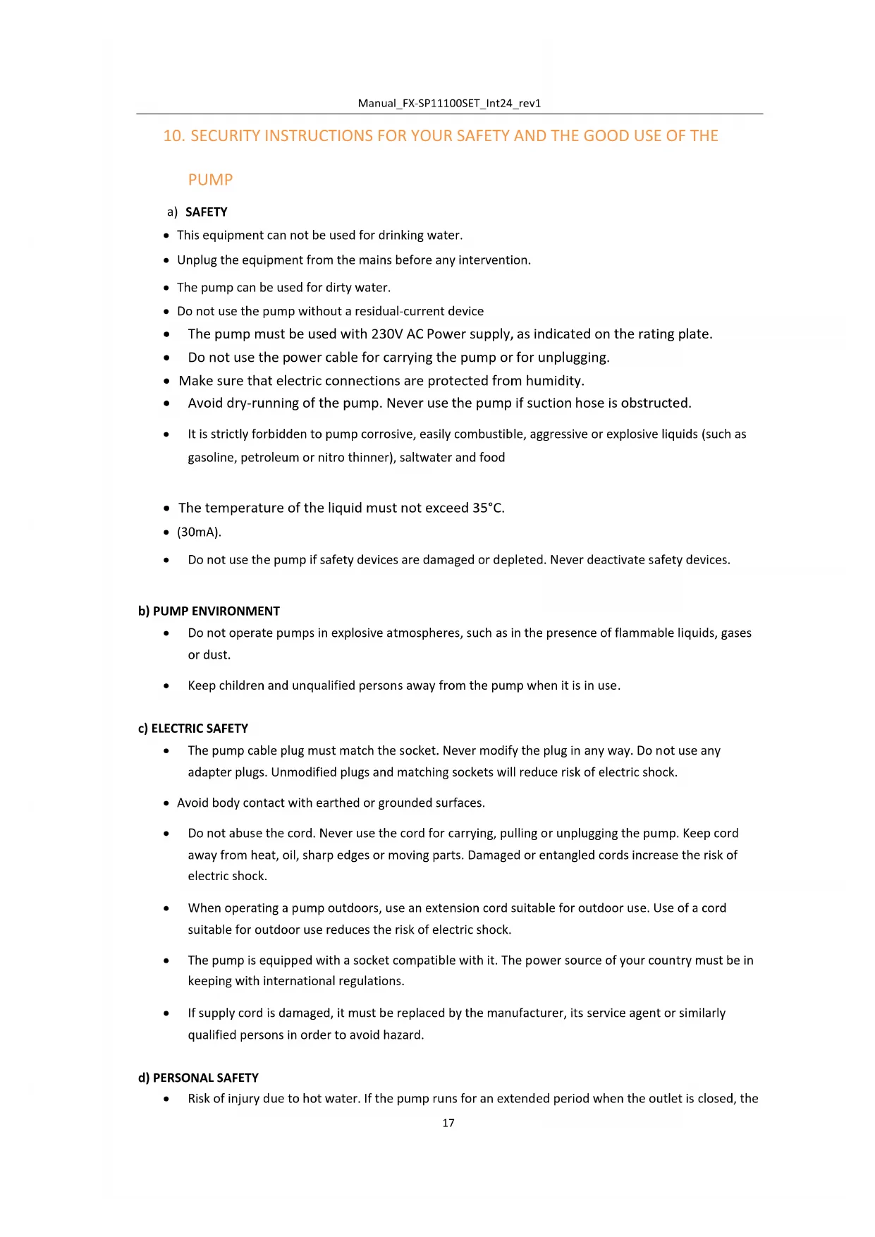 - Do not use the pump if safety devices are damaged or depleted. Never deactivate safety devices. b) PUMP ENVIRONMENT