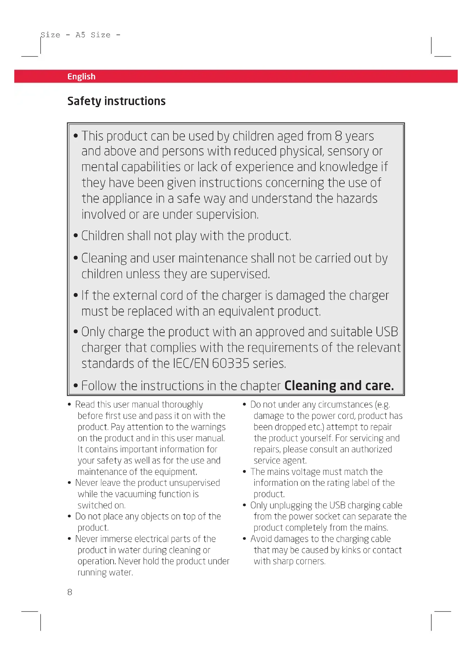 - Only charge the product with an approved and suitable USB charger that complies with the requirements of the relevant standards of the IEC/EN 60335 series.