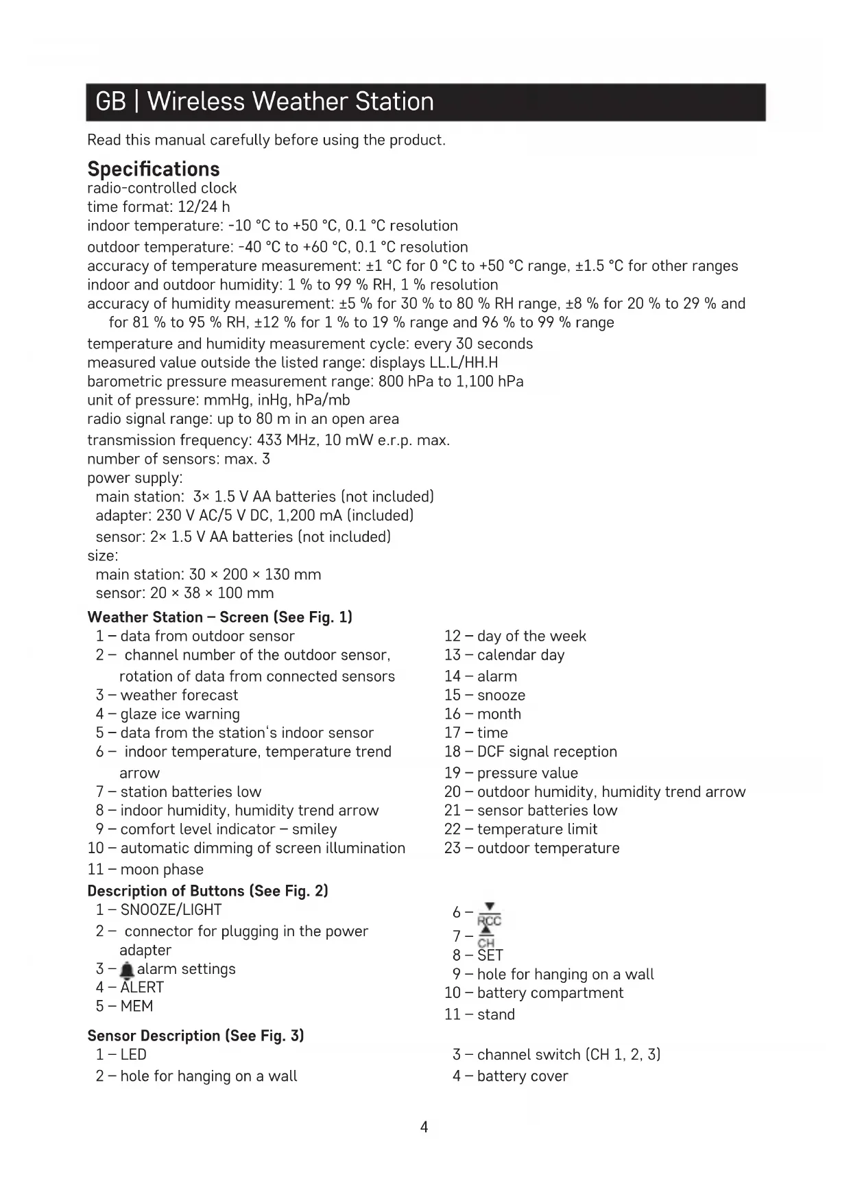GB | Wireless Weather Station Read this manual carefully before using the product. Specications radio-controlled clock time format: 12/24 h indoor temperature: -10 °C to +50 °C, 0.1 °C resolution outdoor temperature: -40 °C to +60 °C, 0.1 °C resolution accuracy of temperature measurement: ±1 °C for 0 °C to +50 °C range, ±1.5 °C for other ranges indoor and outdoor humidity: 1 % to 99 % RH, 1 % resolution accuracy of humidity measurement: ±5 % for 30 % to 80 % RH range, ±8 % for 20 % to 29 % and for 81 % to 95 % RH, ±12 % for 1 % to 19 % range and 96 % to 99 % range temperature and humidity measurement cycle: every 30 seconds measured value outside the listed range: displays LL.L/HH.H barometric pressure measurement range: 800 hPa to 1,100 hPa unit of pressure: mmHg, inHg, hPa/mb radio signal range: up to 80 m in an open area transmission frequency: 433 MHz, 10 mW e.r.p. max. number of sensors: max. 3 power supply: main station: 3× 1.5 V AA batteries (not included) adapter: 230 V AC/5 V DC, 1,200 mA (included) sensor: 2× 1.5 V AA batteries (not included) size: main station: 30 × 200 × 130 mm sensor: 20 × 38 × 100 mm Weather Station – Screen (See Fig. 1) 1 – data from outdoor sensor 2 – channel number of the outdoor sensor, rotation of data from connected sensors 3 – weather forecast 4 – glaze ice warning 5 – data from the station‘s indoor sensor 6 – indoor temperature, temperature trend arrow 7 – station batteries low 8 – indoor humidity, humidity trend arrow 9 – comfort level indicator – smiley 10 – automatic dimming of screen illumination 11 – moon phase 12 – day of the week 13 – calendar day 14 – alarm 15 – snooze 16 – month 17 – time 18 – DCF signal reception 19 – pressure value 20 – outdoor humidity, humidity trend arrow 21 – sensor batteries low 22 – temperature limit 23 – outdoor temperature Description of Buttons (See Fig. 2) 1 – SNOOZE/LIGHT 2 – connector for plugging in the power adapter 3 – alarm settings 4 – ALERT 5 – MEM 6 – 7 – 8 – SET 9 – hole for hanging on a wall 10 – battery compartment 11 – stand Sensor Description (See Fig. 3) 1 – LED 2 – hole for hanging on a wall 3 – channel switch (CH 1, 2, 3) 4 – battery cover5 Getting Started