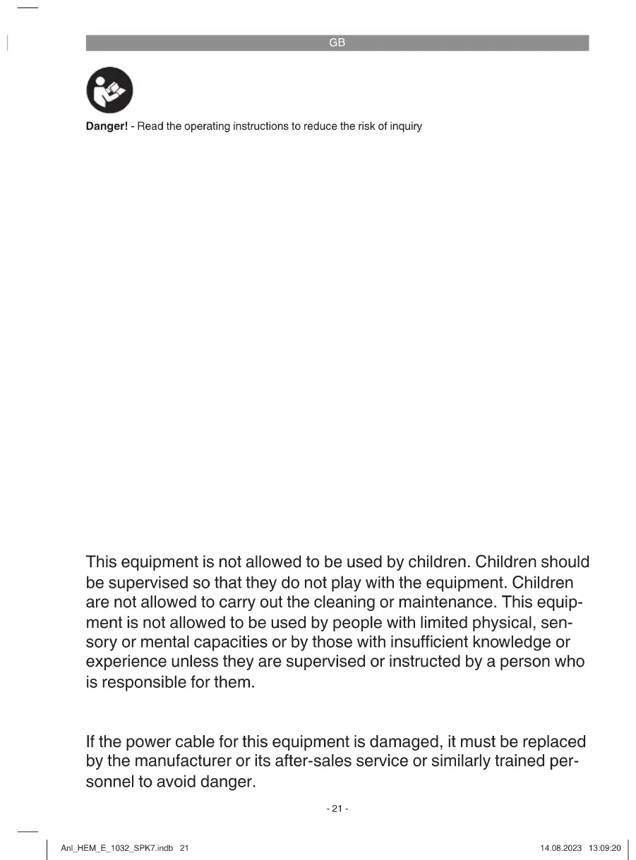 Danger! - Read the operating instructions to reduce the risk of inquiry This equipment is not allowed to be used by children. Children should be supervised so that they do not play with the equipment. Children are not allowed to carry out the cleaning or maintenance. This equip- ment is not allowed to be used by people with limited physical, sen- sory or mental capacities or by those with insuffi cient knowledge or experience unless they are supervised or instructed by a person who is responsible for them. If the power cable for this equipment is damaged, it must be replaced by the manufacturer or its after-sales service or similarly trained per- sonnel to avoid danger. Anl_HEM_E_1032_SPK7.indb 21Anl_HEM_E_1032_SPK7.indb 21 14.08.2023 13:09:2014.08.2023 13:09:20GB