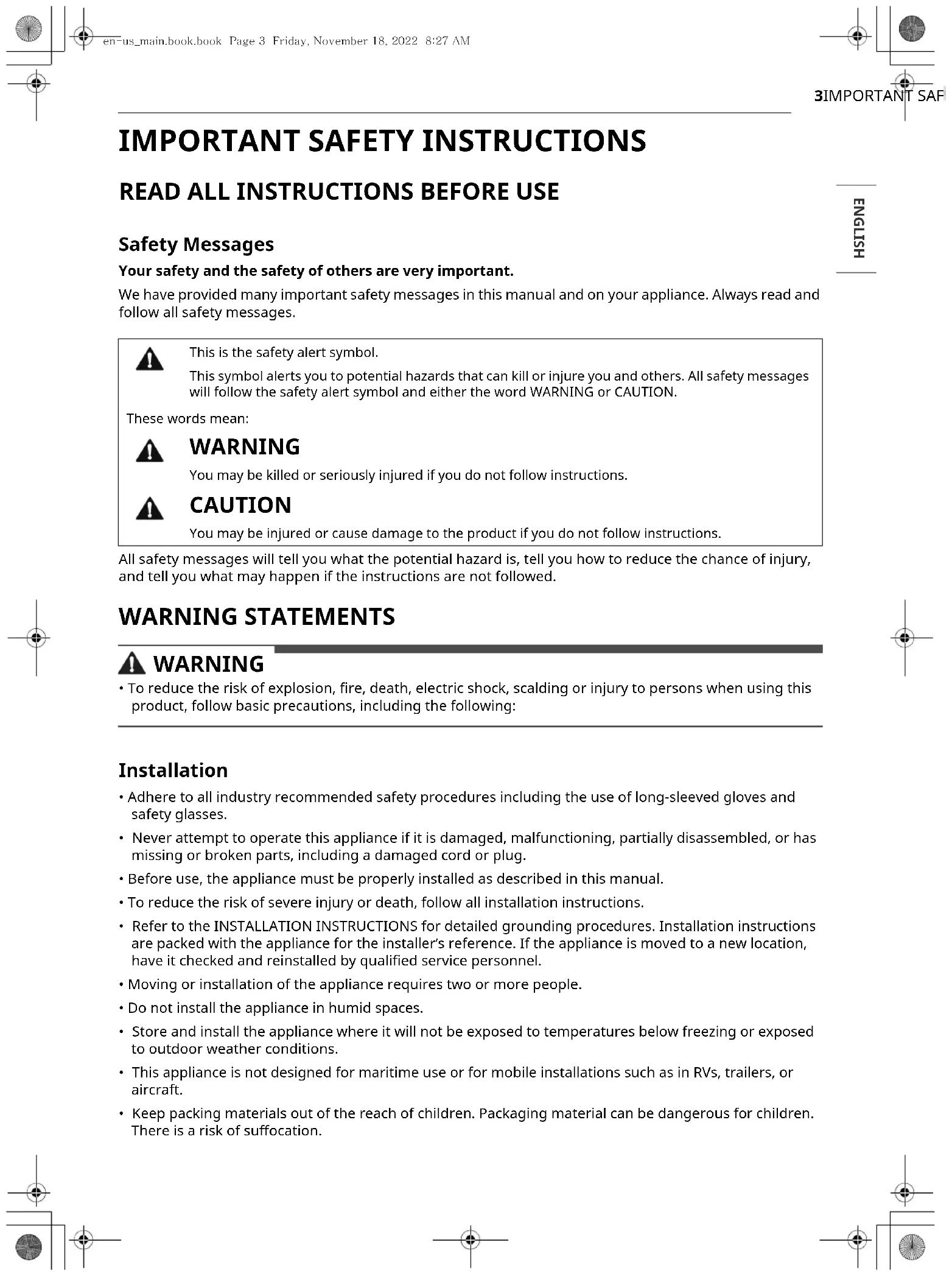 - Keep packing materials out of the reach of children. Packaging material can be dangerous for children. There is a risk of suffocation.This is the safety alert symbol.This symbol alerts you to potential hazards that can kill or injure you and others. All safety messages will follow the safety alert symbol and either the word WARNING or CAUTION. These words mean: WARNING You may be killed or seriously injured if you do not follow instructions. CAUTION You may be injured or cause damage to the product if you do not follow instructions.en-us_main.book.book Page 3 Friday, November 18, 2022 8:27 AM4 IMPORTANT SAFETY INSTRUCTIONS