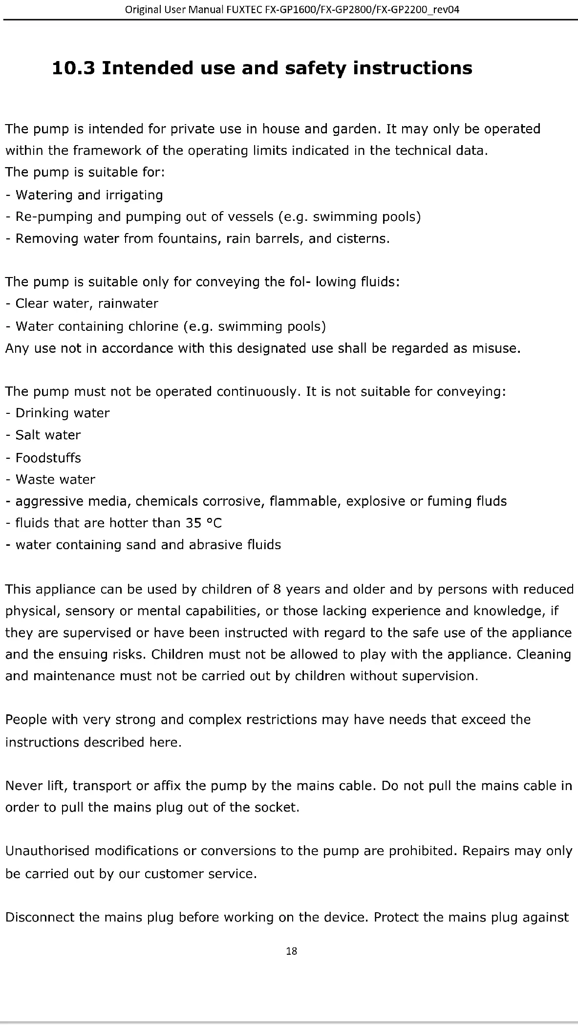 The pump is intended for private use in house and garden. It may only be operated within the framework of the operating limits indicated in the technical data. The pump is suitable for: - Watering and irrigating - Re-pumping and pumping out of vessels (e.g. swimming pools) - Removing water from fountains, rain barrels, and cisterns. The pump is suitable only for conveying the fol- lowing fluids: - Clear water, rainwater - Water containing chlorine (e.g. swimming pools) Any use not in accordance with this designated use shall be regarded as misuse. The pump must not be operated continuously. It is not suitable for conveying: - Drinking water - Salt water - Foodstuffs - Waste water - aggressive media, chemicals corrosive, flammable, explosive or fuming fluds - fluids that are hotter than 35 °C - water containing sand and abrasive fluids This appliance can be used by children of 8 years and older and by persons with reduced physical, sensory or mental capabilities, or those lacking experience and knowledge, if they are supervised or have been instructed with regard to the safe use of the appliance and the ensuing risks. Children must not be allowed to play with the appliance. Cleaning and maintenance must not be carried out by children without supervision. People with very strong and complex restrictions may have needs that exceed the instructions described here. Never lift, transport or affix the pump by the mains cable. Do not pull the mains cable in order to pull the mains plug out of the socket. Unauthorised modifications or conversions to the pump are prohibited. Repairs may only be carried out by our customer service. Disconnect the mains plug before working on the device. Protect the mains plug againstOriginal User Manual FUXTEC FX-GP1600/FX-GP2800/FX-GP2200_rev04
