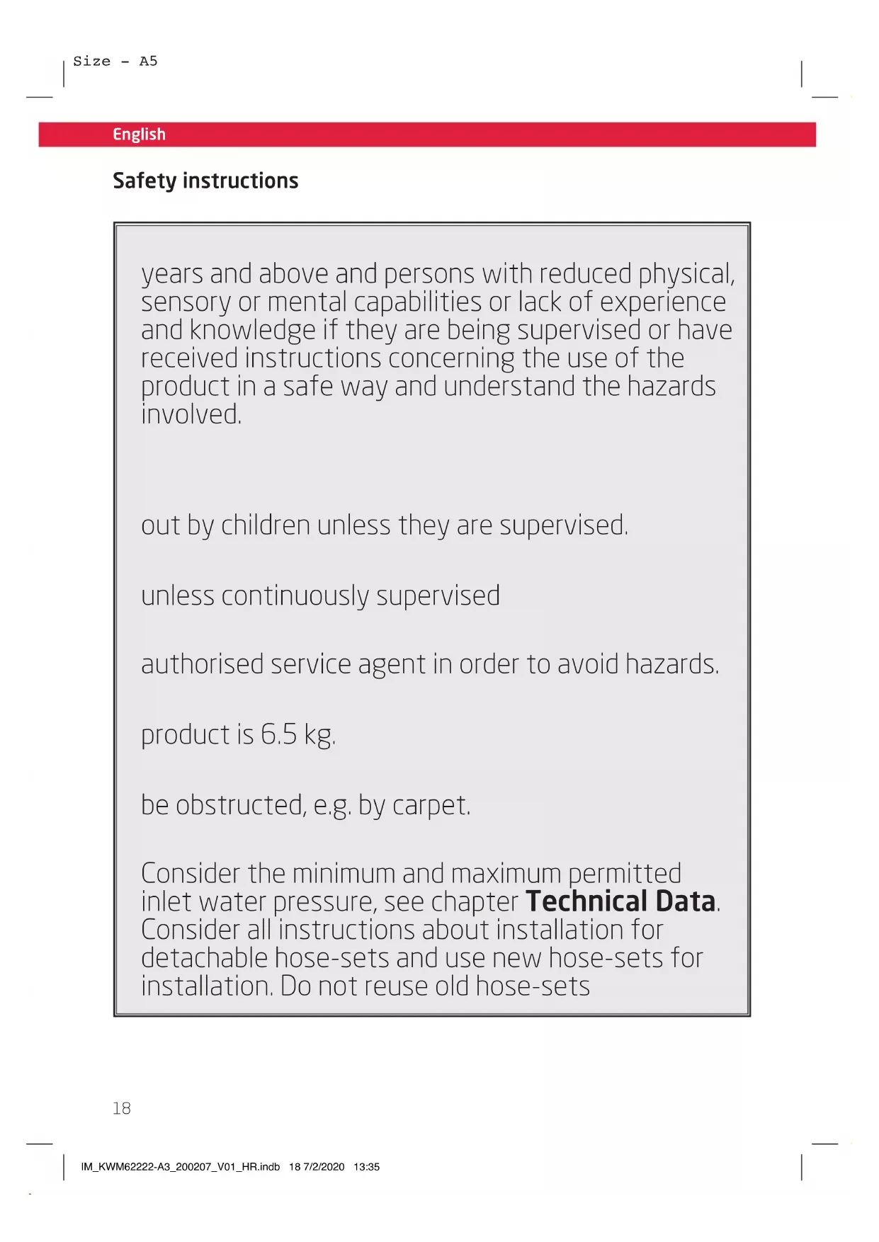 - This product is connected to the water mains. Consider the minimum and maximum permitted inlet water pressure, see chapter Technical Data. Consider all instructions about installation for detachable hose-sets and use new hose-sets for installation. Do not reuse old hose-sets IM_KWM62222-A3_200207_V01_HR.indb 18 7/2/2020 13:35English