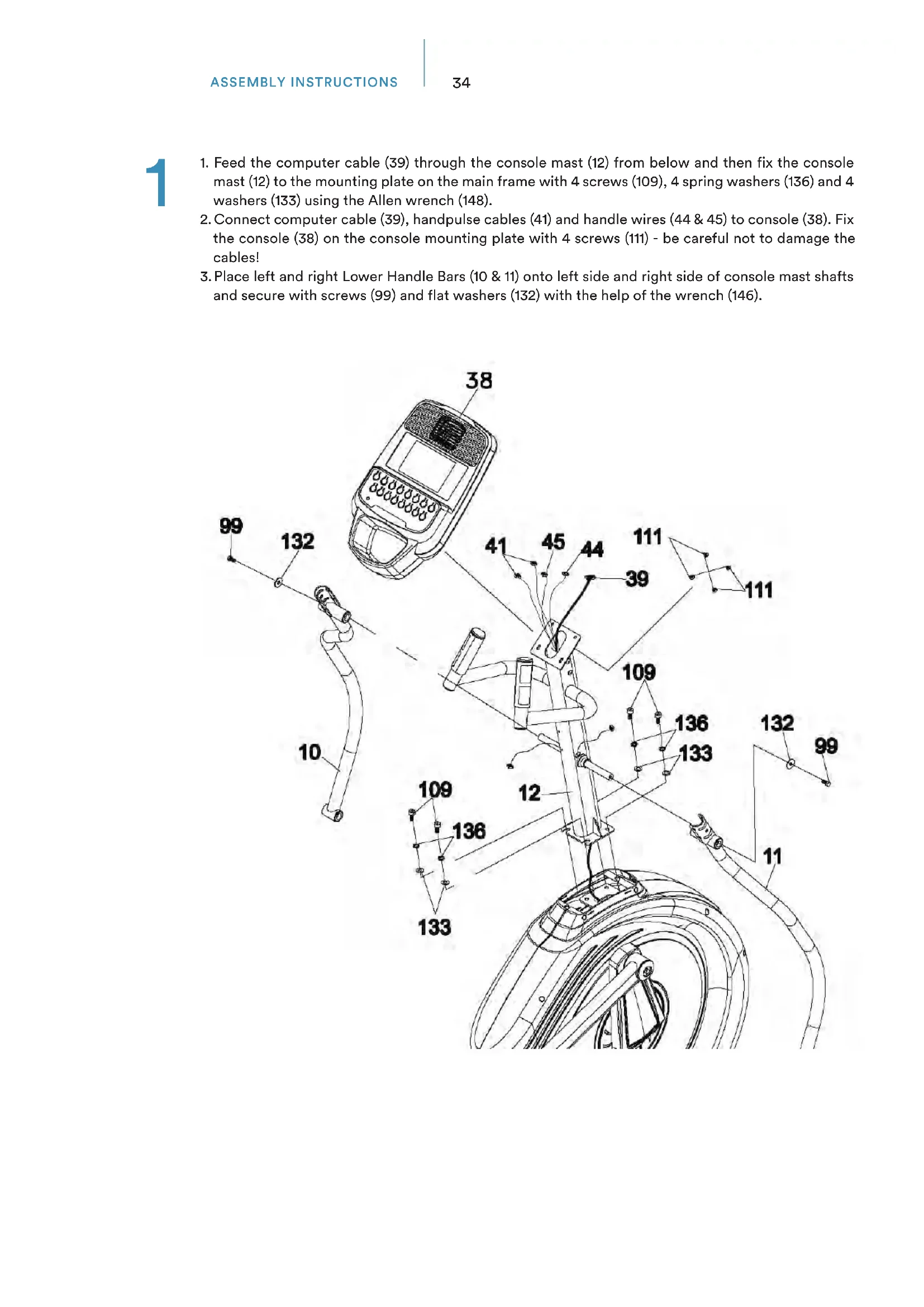 2. Connect computer cable (39), handpulse cables (41) and handle wires (44 & 45) to console (38). Fix
