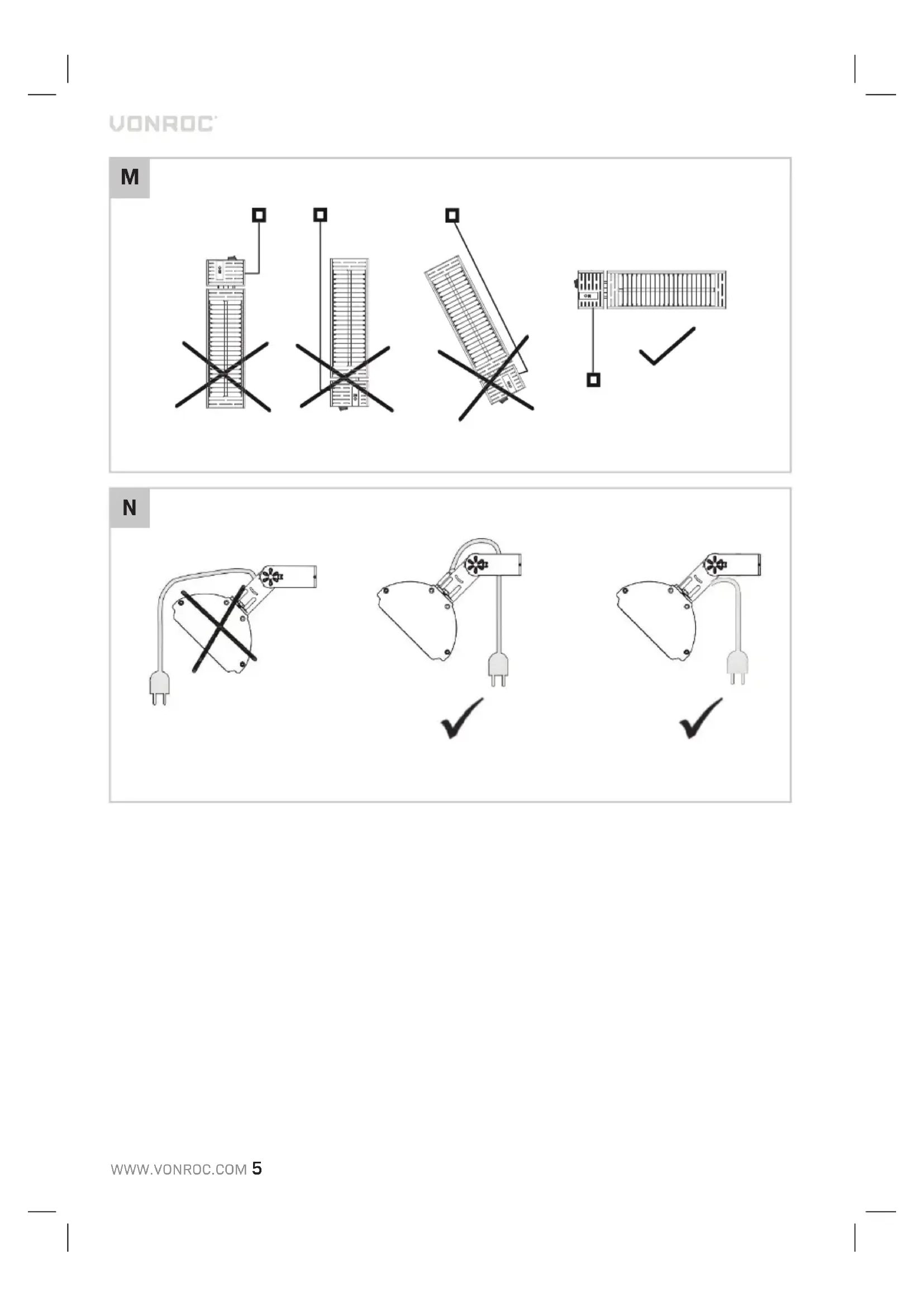 Switching on/off (Fig. A, B) The heater can be turned on and off using the remote control (7) or the mode button (6). Before use, the power switch (5) on the heater must first be turned on. Using the remote control If you do not have the remote control in your pos- session, please contact Vonroc customer service.