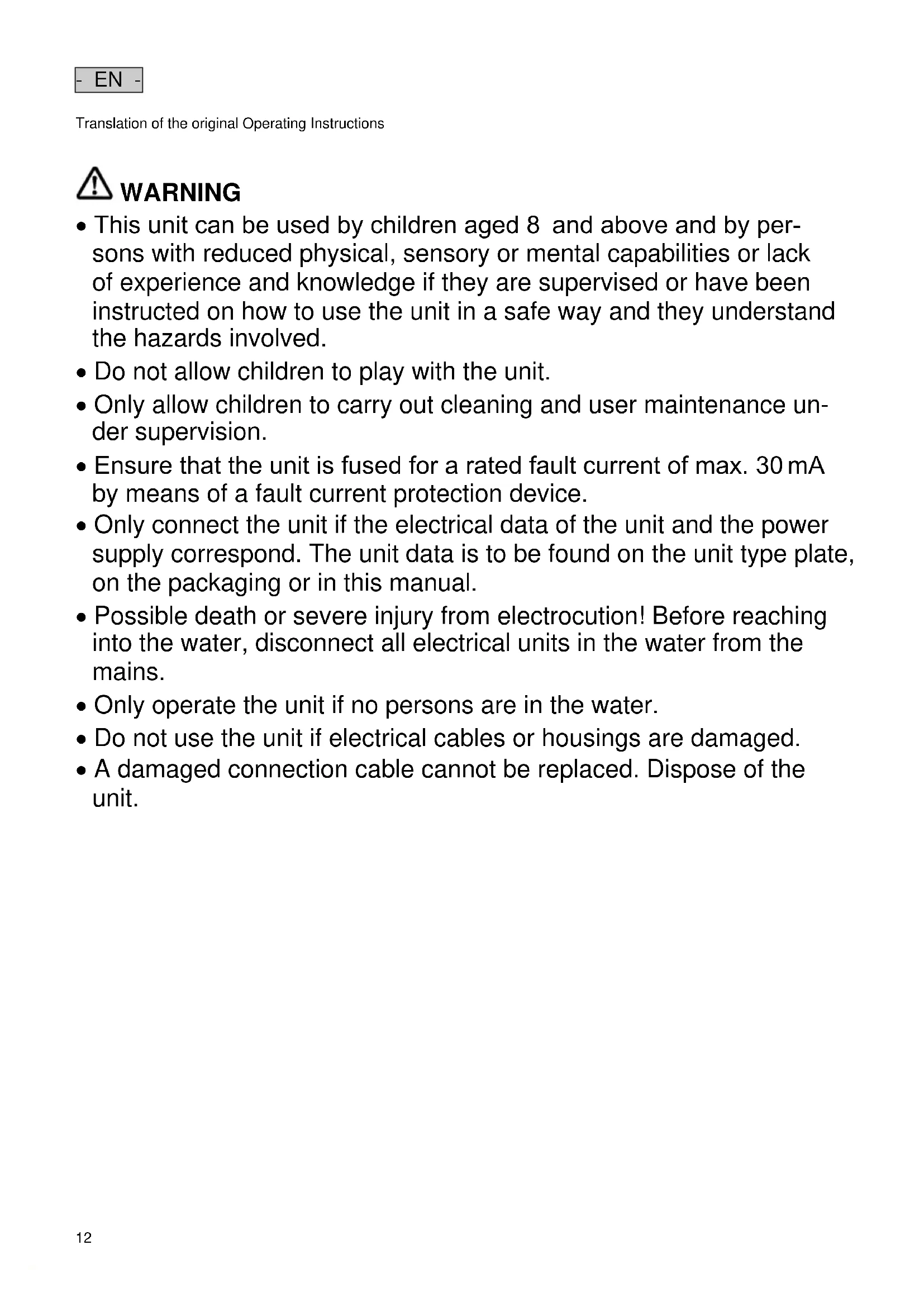 WARNING WARNING This unit can be used by children aged 8 and above and by per- sons with reduced physical, sensory or mental capabilities or lack of experience and knowledge if they are supervised or have been instructed on how to use the unit in a safe way and they understand the hazards involved. Do not allow children to play with the unit. Only allow children to carry out cleaning and user maintenance un- der supervision. Ensure that the unit is fused for a rated fault current of max. 30 mA by means of a fault current protection device. Only connect the unit if the electrical data of the unit and the power supply correspond. The unit data is to be found on the unit type plate, on the packaging or in this manual. Possible death or severe injury from electrocution! Before reaching into the water, disconnect all electrical units in the water from the mains. Only operate the unit if no persons are in the water. Do not use the unit if electrical cables or housings are damaged. A damaged connection cable cannot be replaced. Dispose of the unit.- EN -