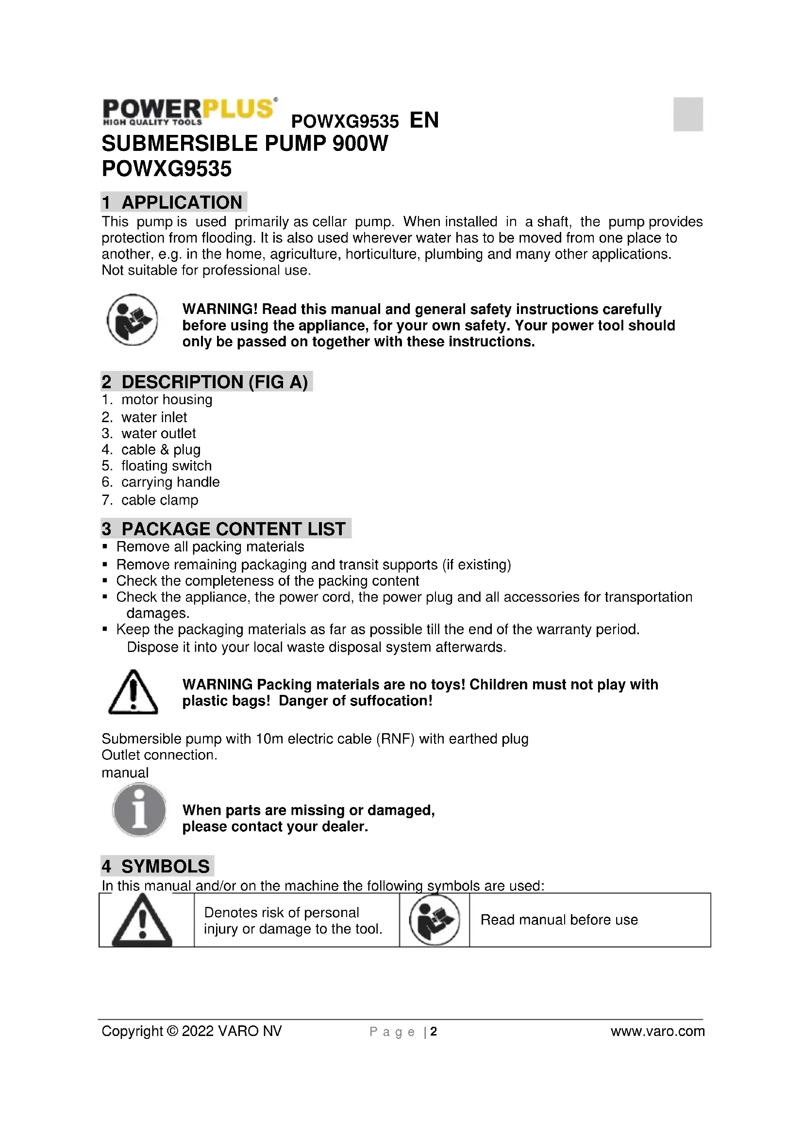 POWXG9535 1 APPLICATION This pump is used primarily as cellar pump. When installed in a shaft, the pump provides protection from flooding. It is also used wherever water has to be moved from one place to another, e.g. in the home, agriculture, horticulture, plumbing and many other applications. Not suitable for professional use. WARNING! Read this manual and general safety instructions carefully before using the appliance, for your own safety. Your power tool should only be passed on together with these instructions. 2 DESCRIPTION (FIG A)