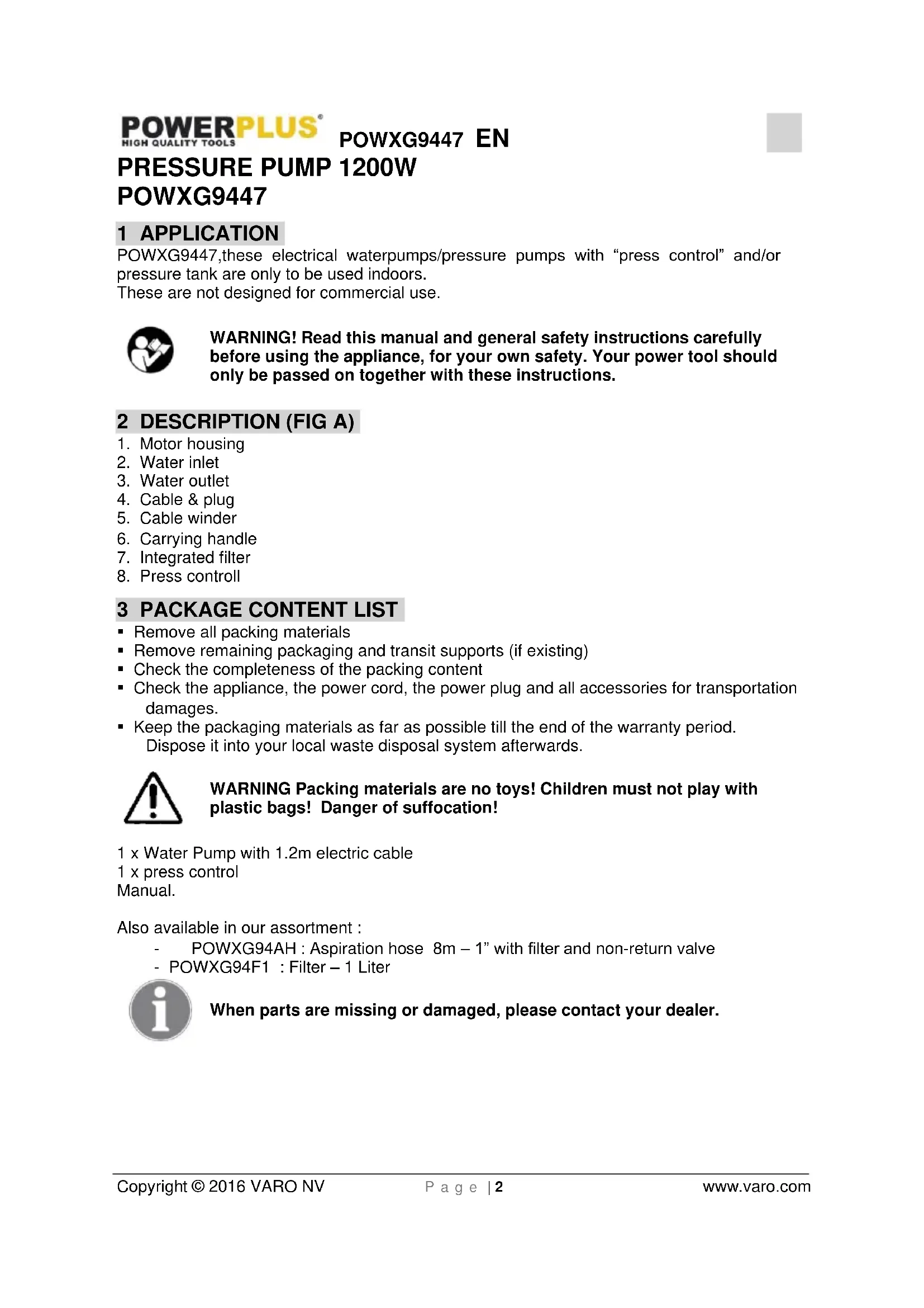Remove all packing materials Remove remaining packaging and transit supports (if existing) Check the completeness of the packing content Check the appliance, the power cord, the power plug and all accessories for transportation damages. Keep the packaging materials as far as possible till the end of the warranty period. Dispose it into your local waste disposal system afterwards. WARNING Packing materials are no toys! Children must not play with plastic bags! Danger of suffocation! 1 x Water Pump with 1.2m electric cable 1 x press control Manual. Also available in our assortment : - POWXG94AH : Aspiration hose 8m – 1” with filter and non-return valve - POWXG94F1 : Filter – 1 Liter When parts are missing or damaged, please contact your dealer.POWXG9447 EN Copyright © 2016 VARO NV P a g e | 3 www.varo.com 4 SYMBOLS In this manual and/or on the machine the following symbols are used: