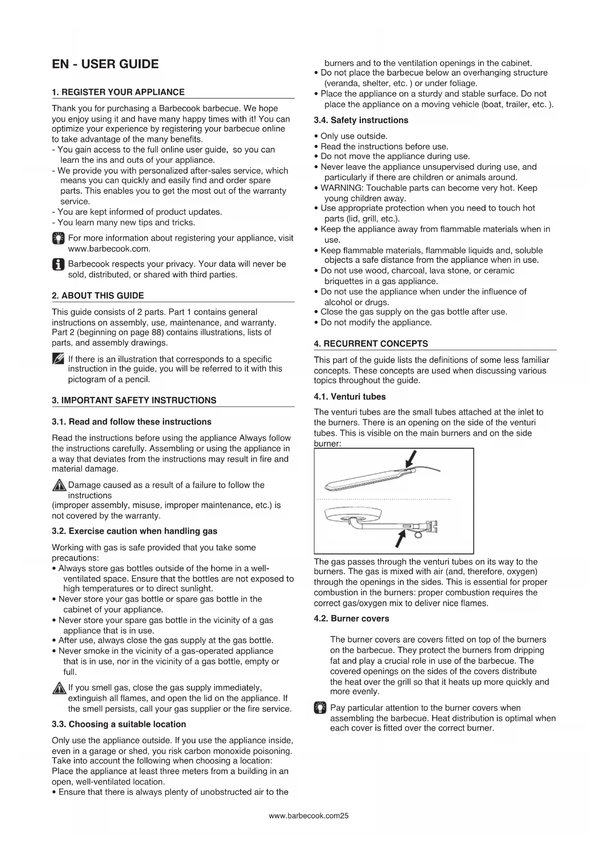 This part of the guide lists the denitions of some less familiar concepts. These concepts are used when discussing various topics throughout the guide. 4.1. Venturi tubes The venturi tubes are the small tubes attached at the inlet to the burners. There is an opening on the side of the venturi tubes. This is visible on the main burners and on the side burner: The gas passes through the venturi tubes on its way to the burners. The gas is mixed with air (and, therefore, oxygen) through the openings in the sides. This is essential for proper combustion in the burners: proper combustion requires the correct gas/oxygen mix to deliver nice ames. 4.2. Burner covers The burner covers are covers tted on top of the burners on the barbecue. They protect the burners from dripping fat and play a crucial role in use of the barbecue. The covered openings on the sides of the covers distribute the heat over the grill so that it heats up more quickly and more evenly. Pay particular attention to the burner covers when assembling the barbecue. Heat distribution is optimal when each cover is tted over the correct burner. www.barbecook.com 254.3. Enamel Some parts of the appliance are covered in a layer of melted glass, also known as enamel. This enamel protects the underlying metal from corrosion. Enamel is a high-quality material: it is corrosion-resistant, it does not degrade under the inuence of high temperatures, and it is very easy to maintain. Since the enamel is less exible than the metal to which it is applied, pieces of enamel may break off when the appliance is used incorrectly. To avoid this problem, you must be careful when assembling enameled parts and you must always maintain the enamel according to the instructions in this guide. 4.4. Flare-ups Flare-ups are sudden ames that spark from the bowl when you are grilling. They are usually caused by dripping fat or marinade.