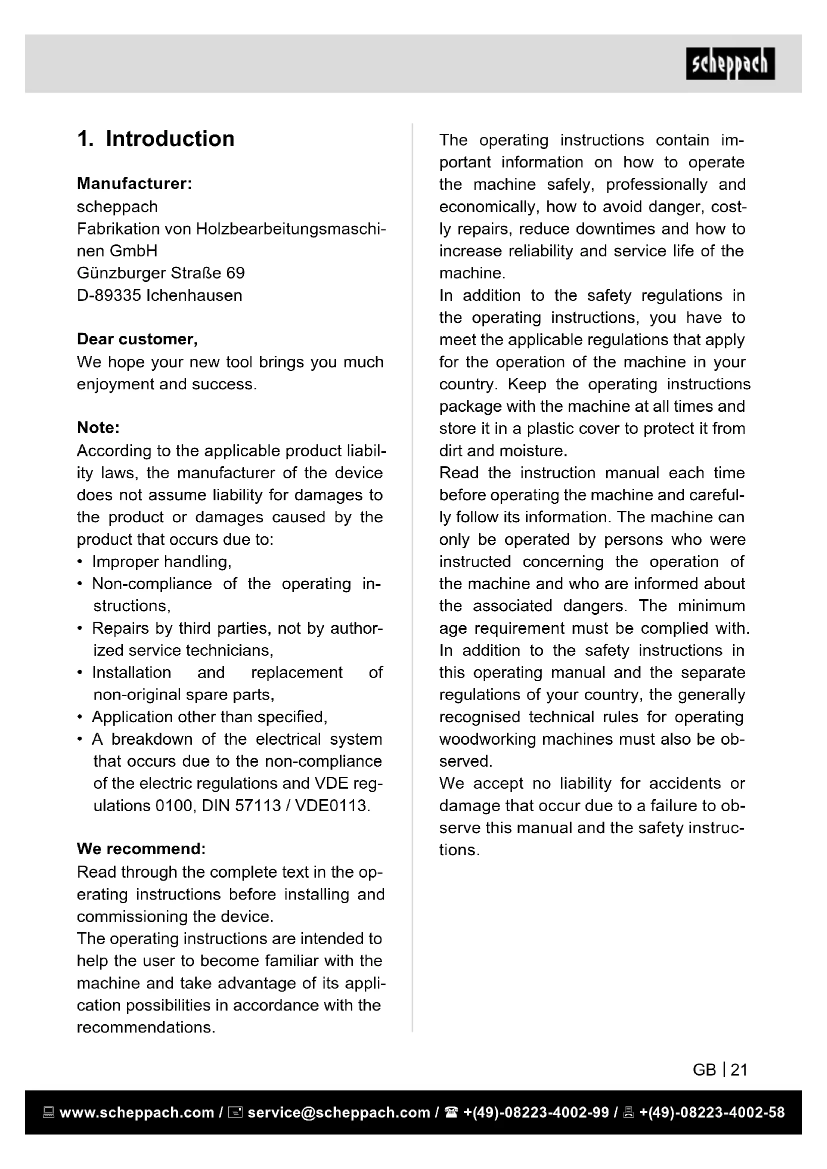 Manufacturer: scheppach Fabrikation von Holzbearbeitungsmaschi- nen GmbH Günzburger Straße 69 D-89335 Ichenhausen Dear customer, We hope your new tool brings you much enjoyment and success. Note: According to the applicable product liabil- ity laws, the manufacturer of the device does not assume liability for damages to the product or damages caused by the product that occurs due to: