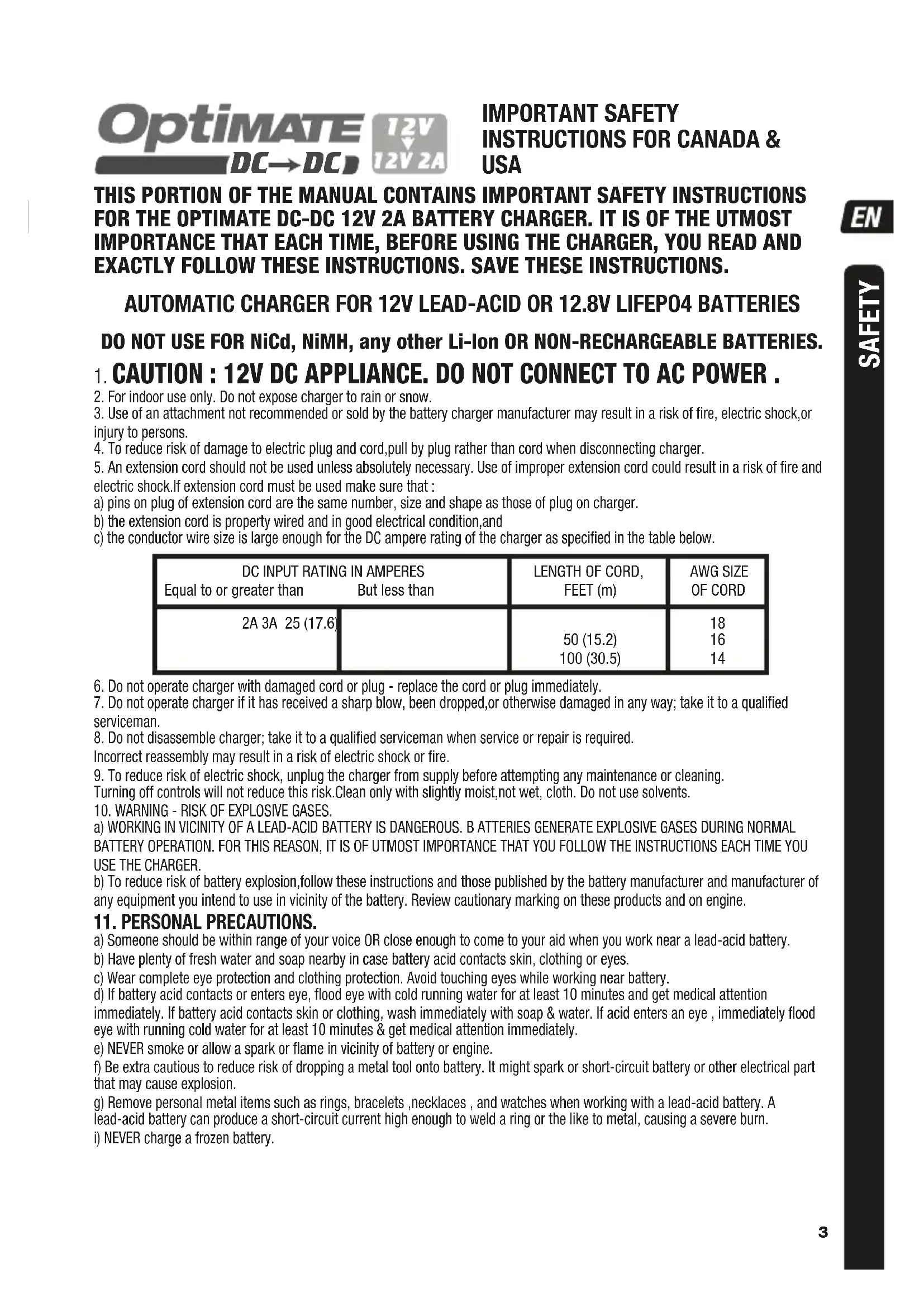DC DC THIS PORTION OF THE MANUAL CONTAINS IMPORTANT SAFETY INSTRUCTIONS FOR THE OPTIMATE DC-DC 12V 2A BATTERY CHARGER. IT IS OF THE UTMOST IMPORTANCE THAT EACH TIME, BEFORE USING THE CHARGER, YOU READ AND EXACTLY FOLLOW THESE INSTRUCTIONS. SAVE THESE INSTRUCTIONS. AUTOMATIC CHARGER FOR 12V LEAD-ACID OR 12.8V LIFEPO4 BATTERIES DO NOT USE FOR NiCd, NiMH, any other Li-Ion OR NON-RECHARGEABLE BATTERIES. 1. CAUTION : 12V DC APPLIANCE. DO NOT CONNECT TO AC POWER .2. For indoor use only. Do not expose charger to rain or snow. 3. Use of an attachment not recommended or sold by the battery charger manufacturer may result in a risk of fire, electric shock,or injury to persons.4. To reduce risk of damage to electric plug and cord,pull by plug rather than cord when disconnecting charger. 5. An extension cord should not be used unless absolutely necessary. Use of improper extension cord could result in a risk of fire and electric shock.If extension cord must be used make sure that : a) pins on plug of extension cord are the same number, size and shape as those of plug on charger. b) the extension cord is property wired and in good electrical condition,and c) the conductor wire size is large enough for the DC ampere rating of the charger as specified in the table below.DC INPUT RATING IN AMPERESEqual to or greater than But less thanLENGTH OF CORD, FEET (m) AWG SIZE OF CORD2A 3A 25 (17.6) 50 (15.2) 100 (30.5)