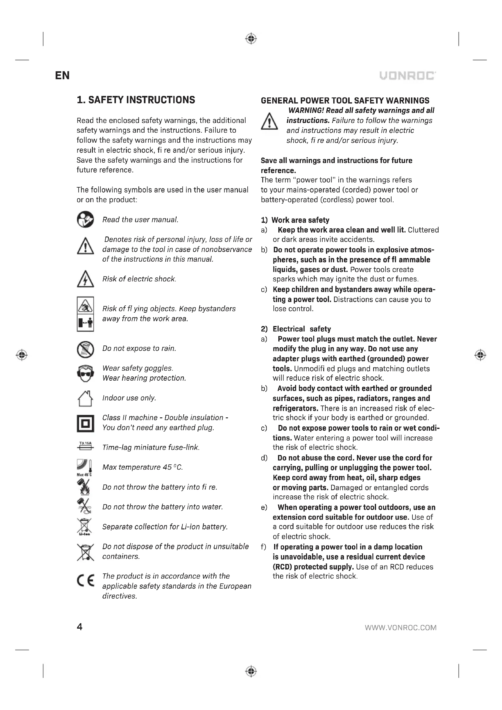 Before cleaning and maintenance, always switch off the machine and remove the battery pack from the machine. Clean the machine casings regularly with a soft cloth, preferably after each use. Make sure that the ventilation openings are free of dust and dirt. Re- move very persistent dirt using a soft cloth moiste- ned with soapsuds. Do not use any solvents such as gasoline, alcohol, ammonia, etc. Chemicals such as these will damage the synthetic components. ENVIRONMENT Faulty and/or discarded electrical or electronic apparatus have to be collected at the appropriate recycling locations. Only for EC countries Do not dispose of power tools into domestic waste. According to the European Guideline 2012/19/ EC for Waste Electrical and Electronic Equipment and its implementation into national right, power tools that are no longer usable must be collected separately and disposed of in an environmentally friendly way. WARRANTY VONROC products are developed to the highest quality standards and are guaranteed free of defects in both materials and workmanship for the period lawfully stipulated starting from the date of original purchase. Should the product develop any failure during this period due to defective material and/or workmanship then contact VONROC directly.10