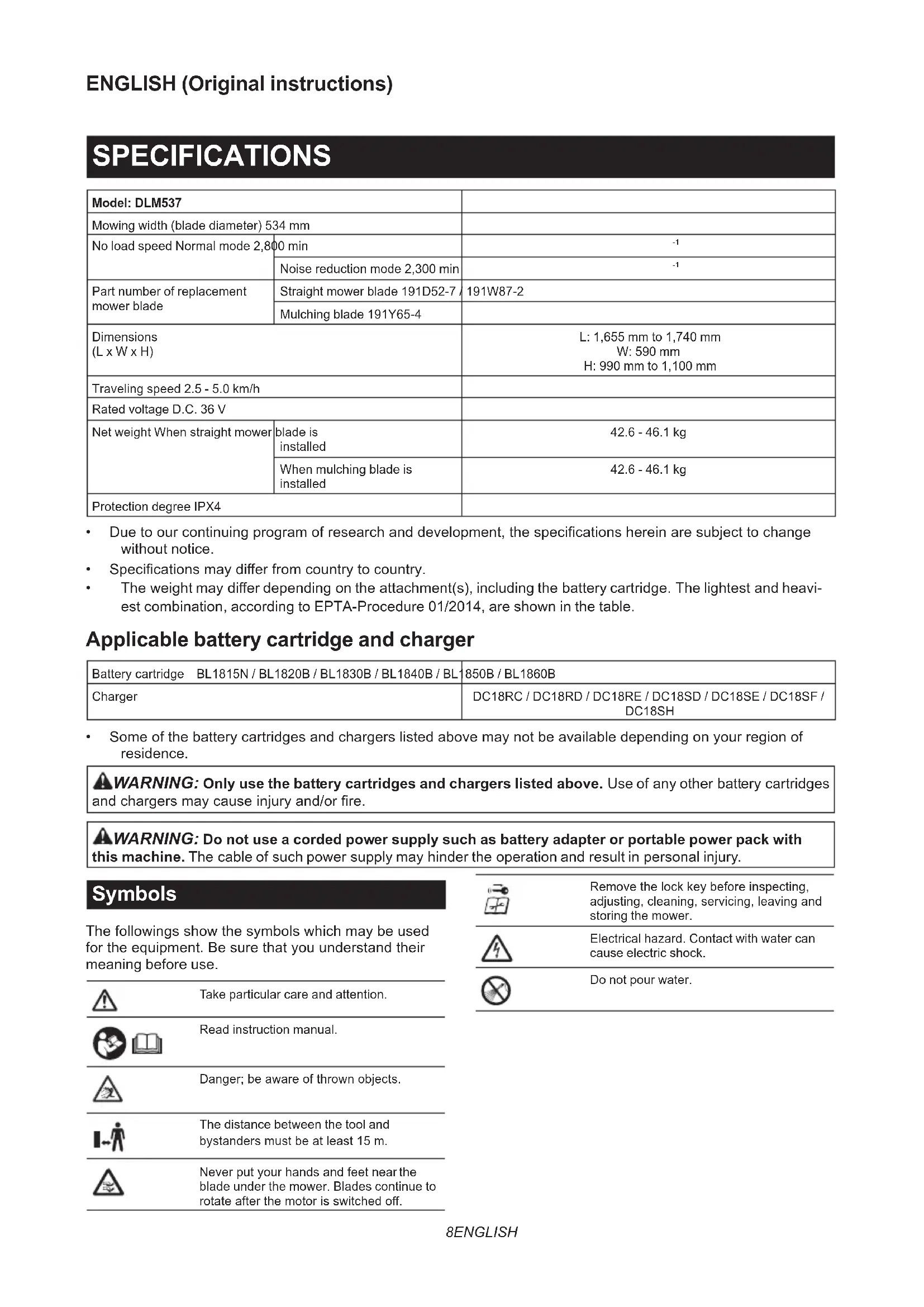 - Theweightmaydierdependingontheattachment(s),includingthebatterycartridge.Thelightestandheavi- est combination, according to EPTA-Procedure 01/2014, are shown in the table. Applicable battery cartridge and charger Batterycartridge BL1815N / BL1820B / BL1830B / BL1840B / BL1850B / BL1860B Charger DC18RC / DC18RD / DC18RE / DC18SD / DC18SE / DC18SF / DC18SH