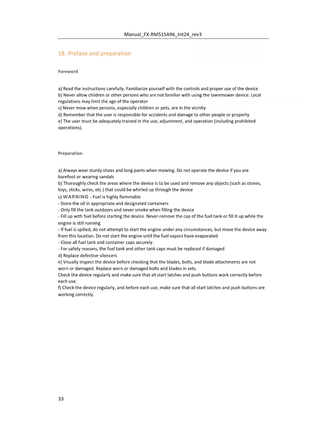 Preparation a) Always wear sturdy shoes and long pants when mowing. Do not operate the device if you are barefoot or wearing sandals b) Thoroughly check the areas where the device is to be used and remove any objects (such as stones, toys, sticks, wires, etc.) that could be whirled up through the device c) WARNING - Fuel is highly flammable - Store the oil in appropriate and designated containers - Only fill the tank outdoors and never smoke when filling the device - Fill up with fuel before starting the device. Never remove the cap of the fuel tank or fill it up while the engine is still running - If fuel is spilled, do not attempt to start the engine under any circumstances, but move the device away from this location. Do not start the engine until the fuel vapors have evaporated - Close all fuel tank and container caps securely. - For safety reasons, the fuel tank and other tank caps must be replaced if damaged d) Replace defective silencers e) Visually inspect the device before checking that the blades, bolts, and blade attachments are not worn or damaged. Replace worn or damaged bolts and blades in sets. Check the device regularly and make sure that all start latches and push buttons work correctly before each use. f) Check the device regularly, and before each use, make sure that all start latches and push buttons are working correctly.Manual_FX-RM51SA96_Int24_rev3
