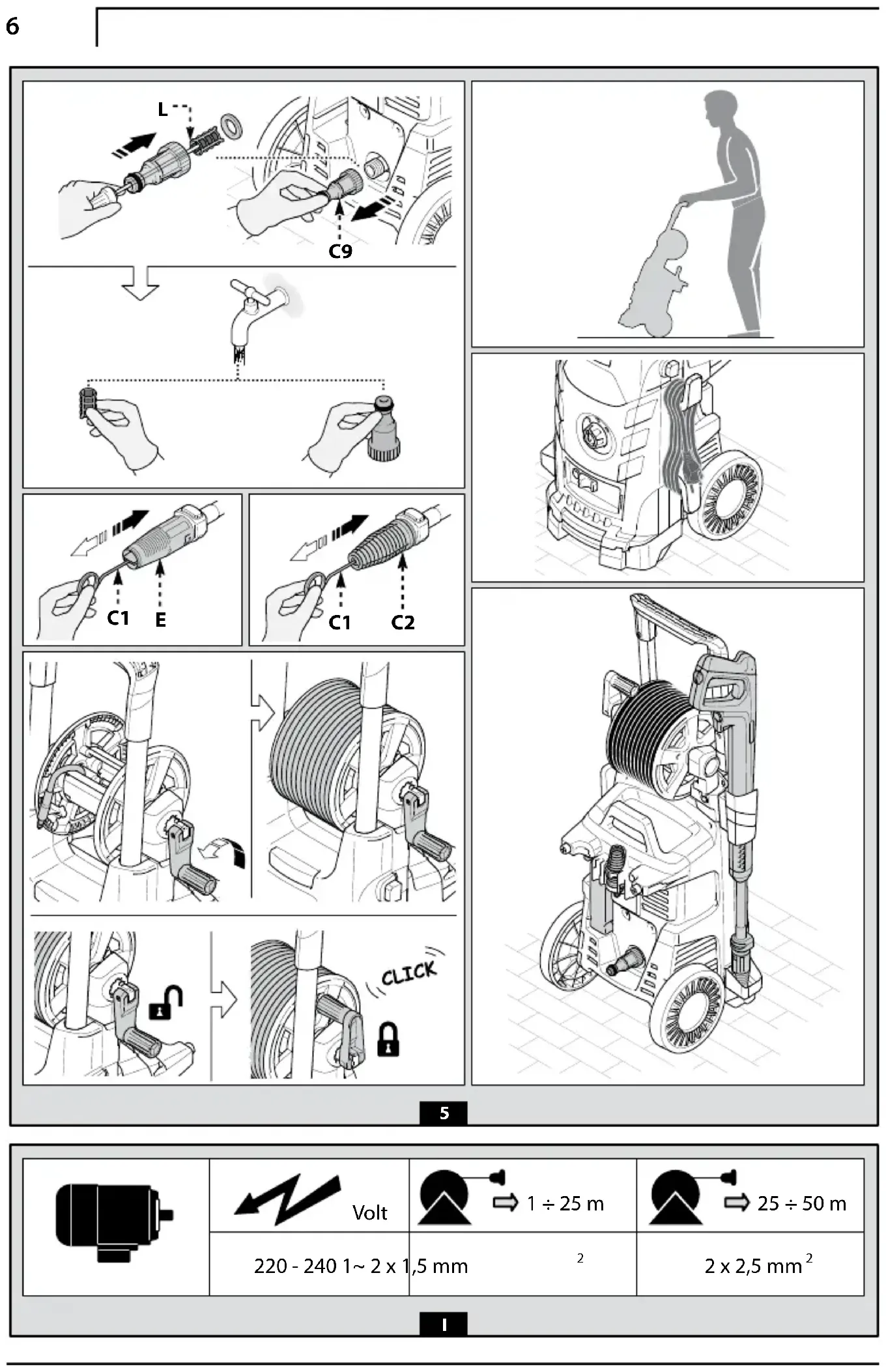 B2 LanceB3 Gun with safety catchB4 Electric cable with plug (on models with this feature)B5 High pressure hoseB6 Detergent tank (on models with this feature)B7 Oil cap (on models with this feature)E NozzleF Detergent regulator (on models with this feature)G Pressure regulator (on models with this feature)L Water filter