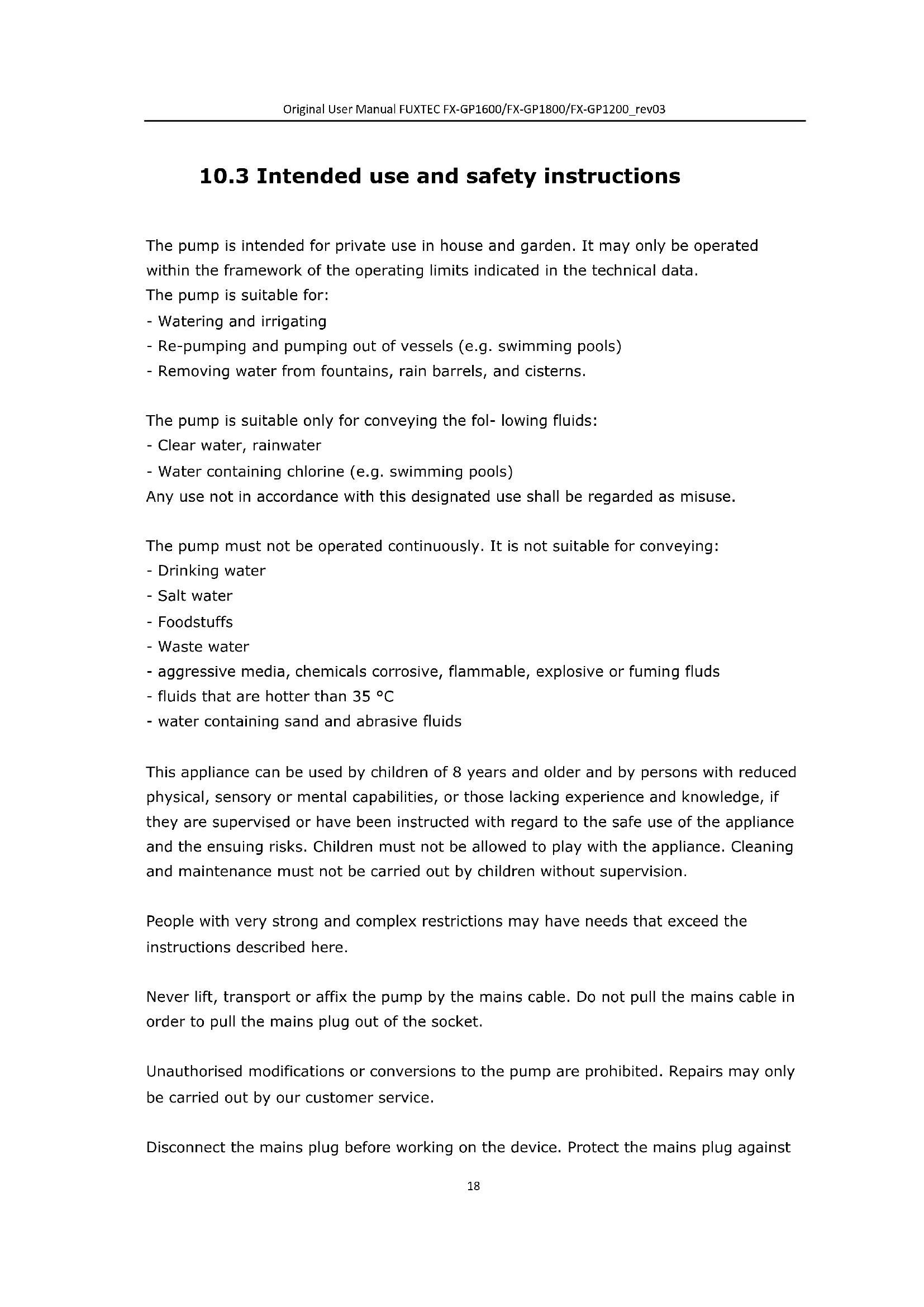 The pump is intended for private use in house and garden. It may only be operated within the framework of the operating limits indicated in the technical data. The pump is suitable for: - Watering and irrigating - Re-pumping and pumping out of vessels (e.g. swimming pools) - Removing water from fountains, rain barrels, and cisterns. The pump is suitable only for conveying the fol- lowing fluids: - Clear water, rainwater - Water containing chlorine (e.g. swimming pools) Any use not in accordance with this designated use shall be regarded as misuse. The pump must not be operated continuously. It is not suitable for conveying: - Drinking water - Salt water - Foodstuffs - Waste water - aggressive media, chemicals corrosive, flammable, explosive or fuming fluds - fluids that are hotter than 35 °C - water containing sand and abrasive fluids This appliance can be used by children of 8 years and older and by persons with reduced physical, sensory or mental capabilities, or those lacking experience and knowledge, if they are supervised or have been instructed with regard to the safe use of the appliance and the ensuing risks. Children must not be allowed to play with the appliance. Cleaning and maintenance must not be carried out by children without supervision. People with very strong and complex restrictions may have needs that exceed the instructions described here. Never lift, transport or affix the pump by the mains cable. Do not pull the mains cable in order to pull the mains plug out of the socket. Unauthorised modifications or conversions to the pump are prohibited. Repairs may only be carried out by our customer service. Disconnect the mains plug before working on the device. Protect the mains plug againstOriginal User Manual FUXTEC FX-GP1600/FX-GP1800/FX-GP1200_rev03