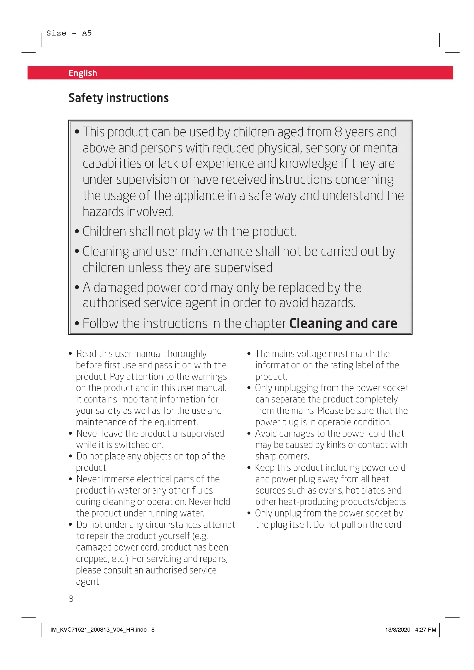 - Never immerse any electrical parts of the product in water or in other liquids during cleaning. Never place it under running water. IM_KVC71521_200813_V04_HR.indb 11IM_KVC71521_200813_V04_HR.indb 11 13/8/2020 4:27 PM13/8/2020 4:27 PMSize - A5