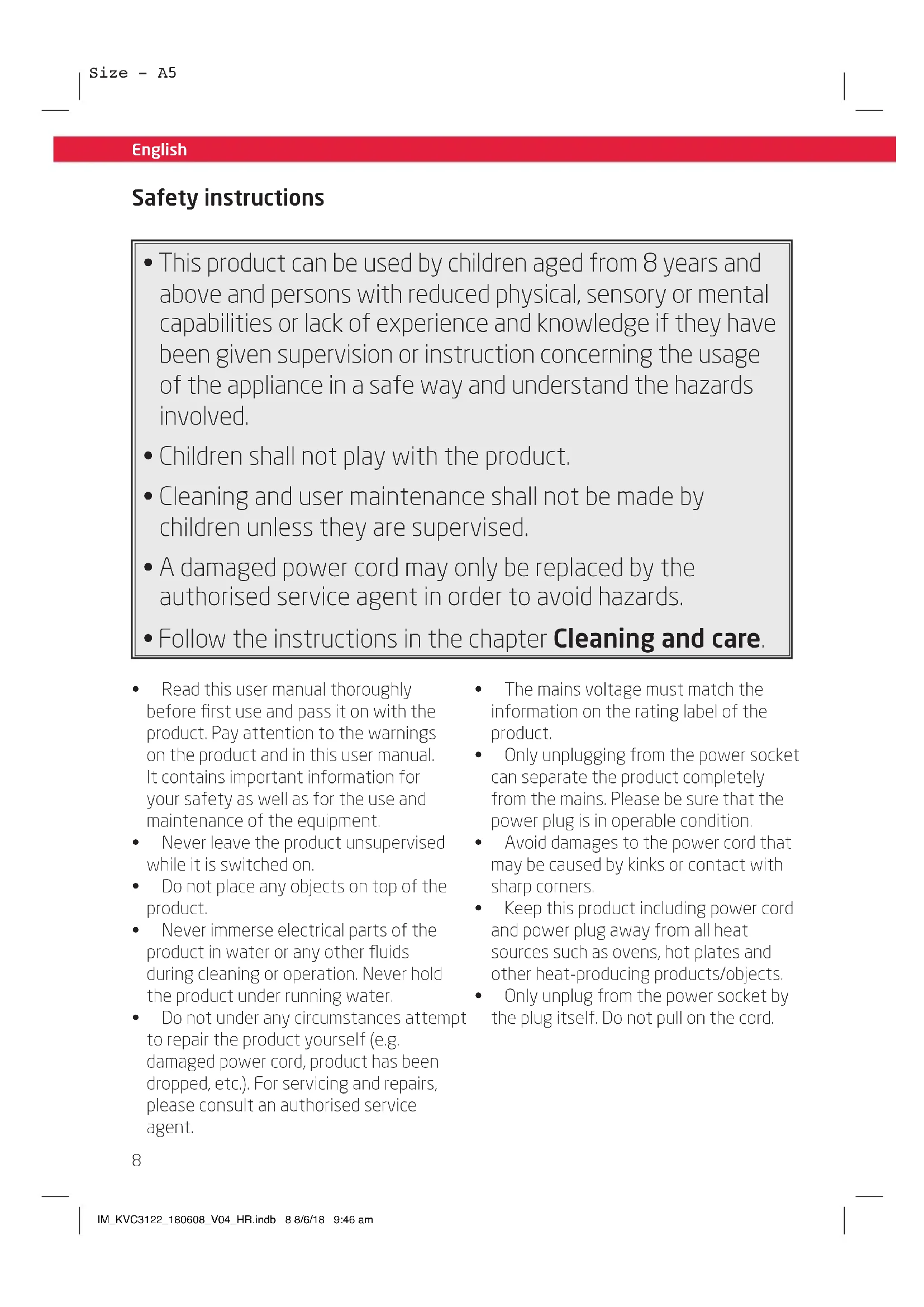 - Never immerse any electrical parts of the product in water or in other liquids during cleaning. Never place it under running water. IM_KVC3122_180608_V04_HR.indb 11 8/6/18 9:46 amSize - A5