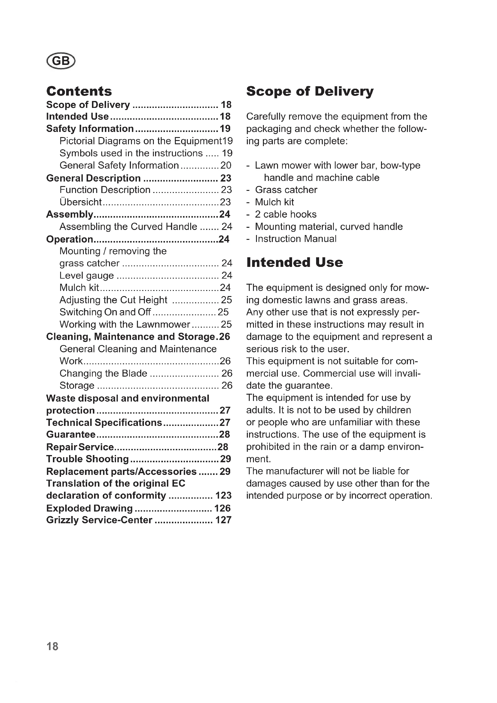 - Scope of Delivery Carefully remove the equipment from the packaging and check whether the follow- ing parts are complete: - Lawn mower with lower bar, bow-type handle and machine cable - Grass catcher - Mulch kit - 2 cable hooks - Mounting material, curved handle - Instruction Manual Intended Use The equipment is designed only for mow- ing domestic lawns and grass areas. Any other use that is not expressly per- mitted in these instructions may result in damage to the equipment and represent a serious risk to the user. This equipment is not suitable for com- mercial use. Commercial use will invali- date the guarantee. The equipment is intended for use by adults. It is not to be used by children or people who are unfamiliar with these instructions. The use of the equipment is prohibited in the rain or a damp environ- ment. The manufacturer will not be liable for damages caused by use other than for the intended purpose or by incorrect operation. Translation of the original EC declaration of conformity p. 123