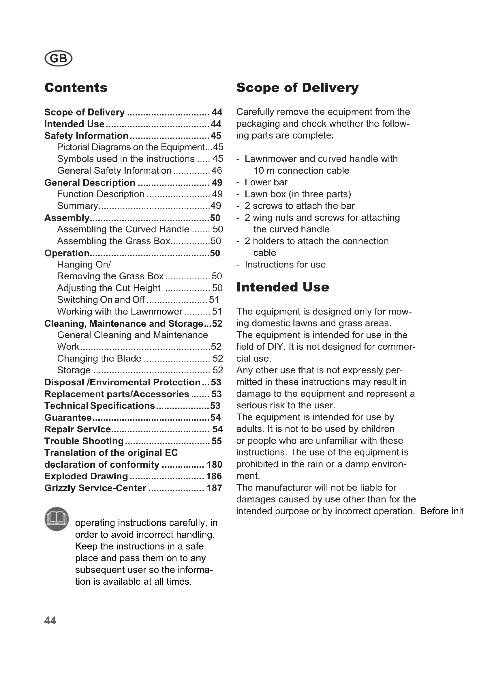 - Scope of Delivery Carefully remove the equipment from the packaging and check whether the follow- ing parts are complete: - Lawnmower and curved handle with 10 m connection cable - Lower bar - Lawn box (in three parts) - 2 screws to attach the bar - 2 wing nuts and screws for attaching the curved handle - 2 holders to attach the connection cable - Instructions for use Intended Use The equipment is designed only for mow- ing domestic lawns and grass areas. The equipment is intended for use in the eld of DIY. It is not designed for commer- cial use. Any other use that is not expressly per- mitted in these instructions may result in damage to the equipment and represent a serious risk to the user. The equipment is intended for use by adults. It is not to be used by children or people who are unfamiliar with these instructions. The use of the equipment is prohibited in the rain or a damp environ- ment. The manufacturer will not be liable for damages caused by use other than for the intended purpose or by incorrect operation. Before initial use, please read the operating instructions carefully, in order to avoid incorrect handling. Keep the instructions in a safe place and pass them on to any subsequent user so the informa- tion is available at all times. Translation of the original EC declaration of conformity p. 180