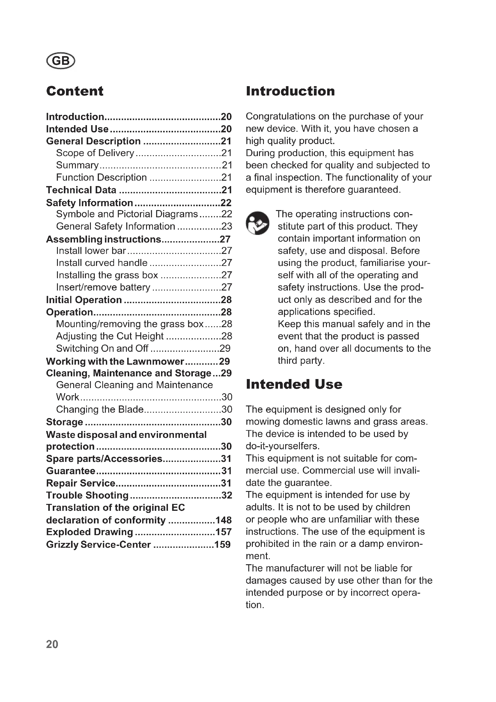 - Introduction Congratulations on the purchase of your new device. With it, you have chosen a high quality product. During production, this equipment has been checked for quality and subjected to a nal inspection. The functionality of your equipment is therefore guaranteed. The operating instructions con- stitute part of this product. They contain important information on safety, use and disposal. Before using the product, familiarise your- self with all of the operating and safety instructions. Use the prod- uct only as described and for the applications specied. Keep this manual safely and in the event that the product is passed on, hand over all documents to the third party. Intended Use The equipment is designed only for mowing domestic lawns and grass areas. The device is intended to be used by do-it-yourselfers. This equipment is not suitable for com- mercial use. Commercial use will invali- date the guarantee. The equipment is intended for use by adults. It is not to be used by children or people who are unfamiliar with these instructions. The use of the equipment is prohibited in the rain or a damp environ- ment. The manufacturer will not be liable for damages caused by use other than for the intended purpose or by incorrect opera- tion. Translation of the original EC declaration of conformity p. 148