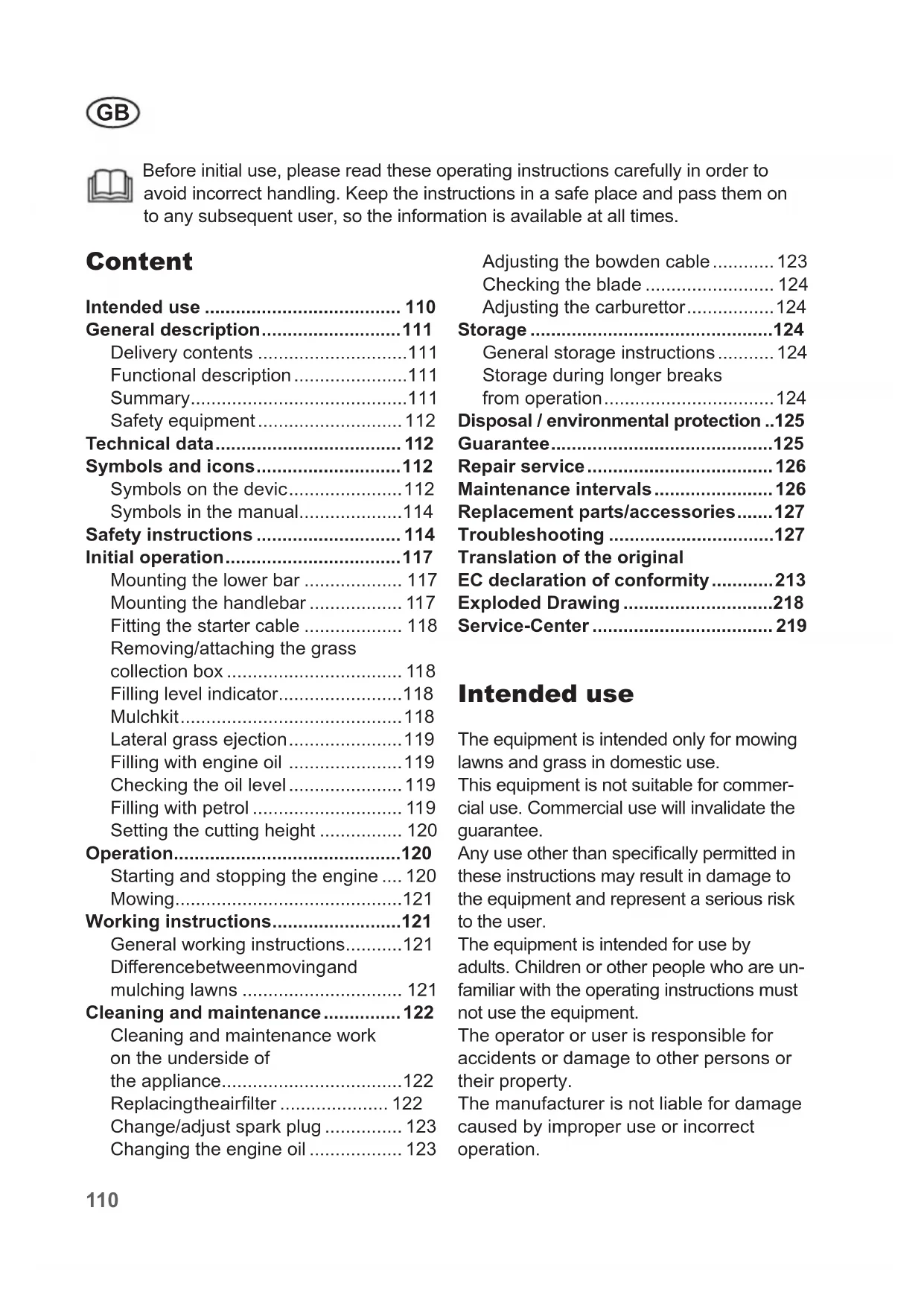 Intended use The equipment is intended only for mowing lawns and grass in domestic use. This equipment is not suitable for commer- cial use. Commercial use will invalidate the guarantee. Any use other than specically permitted in these instructions may result in damage to the equipment and represent a serious risk to the user. The equipment is intended for use by adults. Children or other people who are un- familiar with the operating instructions must not use the equipment. The operator or user is responsible for accidents or damage to other persons or their property. The manufacturer is not liable for damage caused by improper use or incorrect operation. Before initial use, please read these operating instructions carefully in order to avoid incorrect handling. Keep the instructions in a safe place and pass them on to any subsequent user, so the information is available at all times. Translation of the original EC declaration of conformity