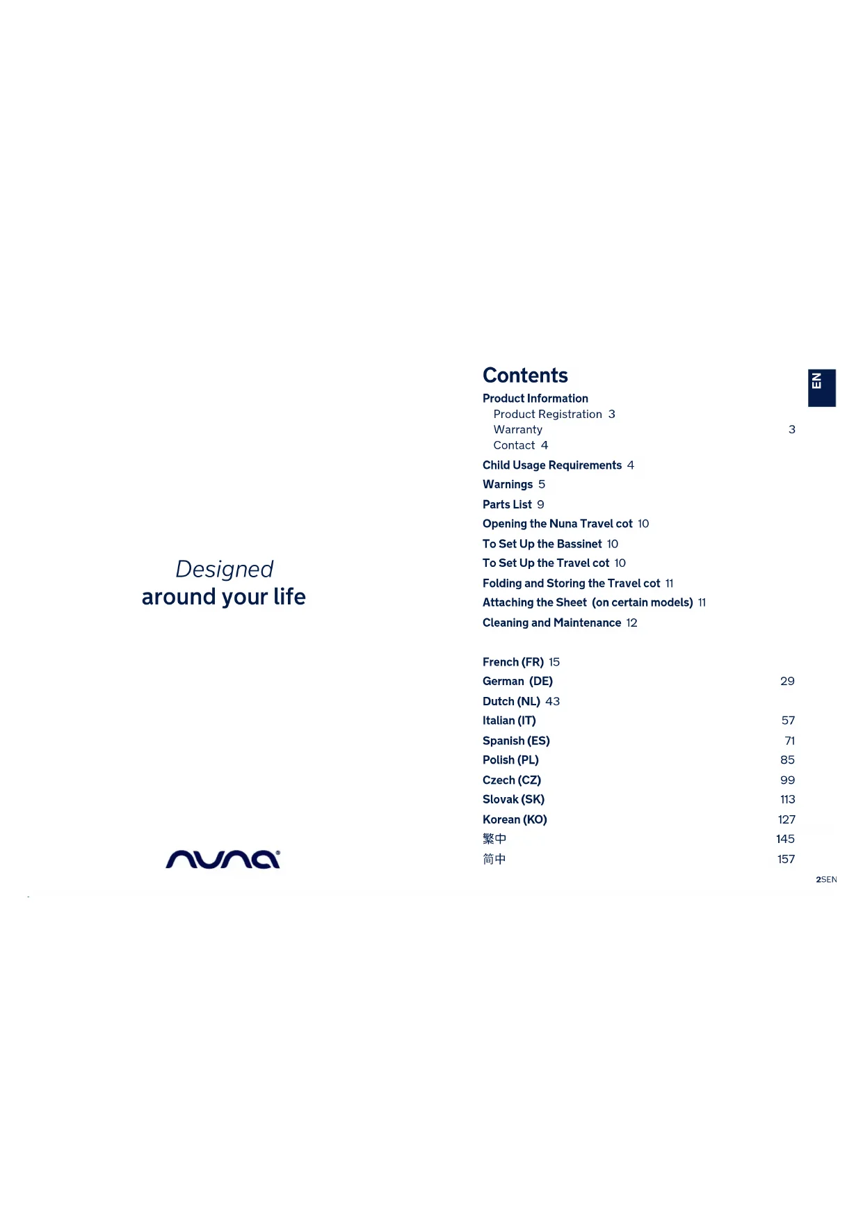 17EN 2SENA aire Instructions Contents Product Information Product Registration 3 Warranty 3 Contact 4 Child Usage Requirements 4 Warnings 5 Parts List 9 Opening the Nuna Travel cot 10 To Set Up the Bassinet 10 To Set Up the Travel cot 10 Folding and Storing the Travel cot 11 Attaching the Sheet (on certain models) 11 Cleaning and Maintenance 12 French (FR) 15 German (DE) 29 Dutch (NL) 43 Italian (IT) 57 Spanish (ES) 71 Polish (PL) 85 Czech (CZ) 99 Slovak (SK) 113 Korean (KO) 127 繁中 145 簡中 157 Designed around your lifeEN