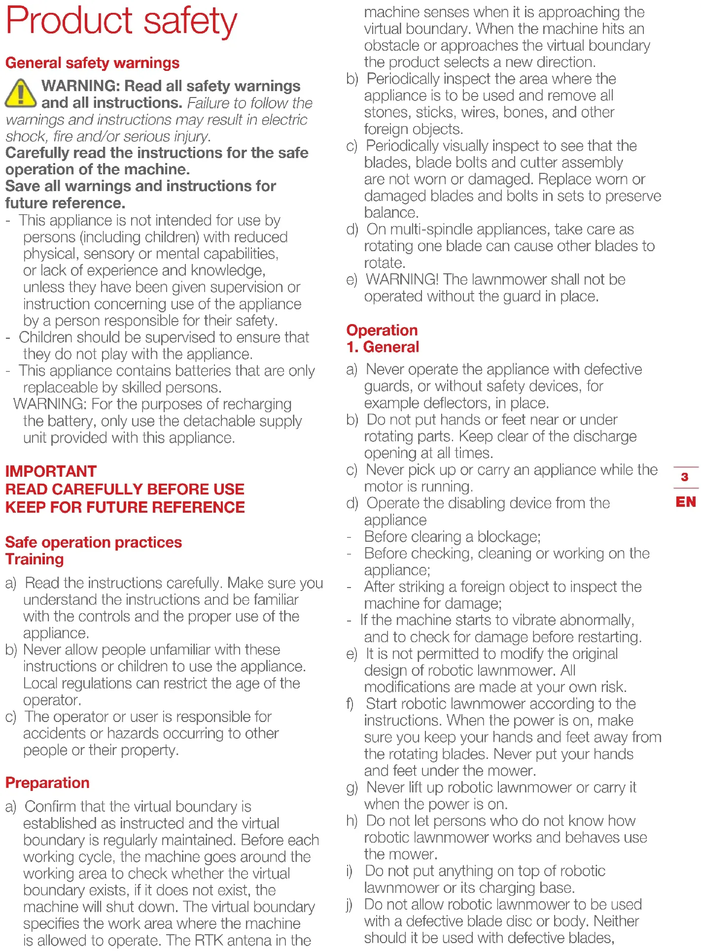 Never allow people unfamiliar with these instructions or children to use the appliance. Local regulations can restrict the age of the operator. c) The operator or user is responsible for accidents or hazards occurring to other people or their property. Preparation a) Confirm that the virtual boundary is established as instructed and the virtual boundary is regularly maintained. Before each working cycle, the machine goes around the working area to check whether the virtual boundary exists, if it does not exist, the machine will shut down. The virtual boundary specifies the work area where the machine is allowed to operate. The RTK antena in the machine senses when it is approaching the virtual boundary. When the machine hits an obstacle or approaches the virtual boundary the product selects a new direction. b) Periodically inspect the area where the appliance is to be used and remove all stones, sticks, wires, bones, and other foreign objects. c) Periodically visually inspect to see that the blades, blade bolts and cutter assembly are not worn or damaged. Replace worn or damaged blades and bolts in sets to preserve balance. d) On multi-spindle appliances, take care as rotating one blade can cause other blades to rotate. e) WARNING! The lawnmower shall not be operated without the guard in place. Operation