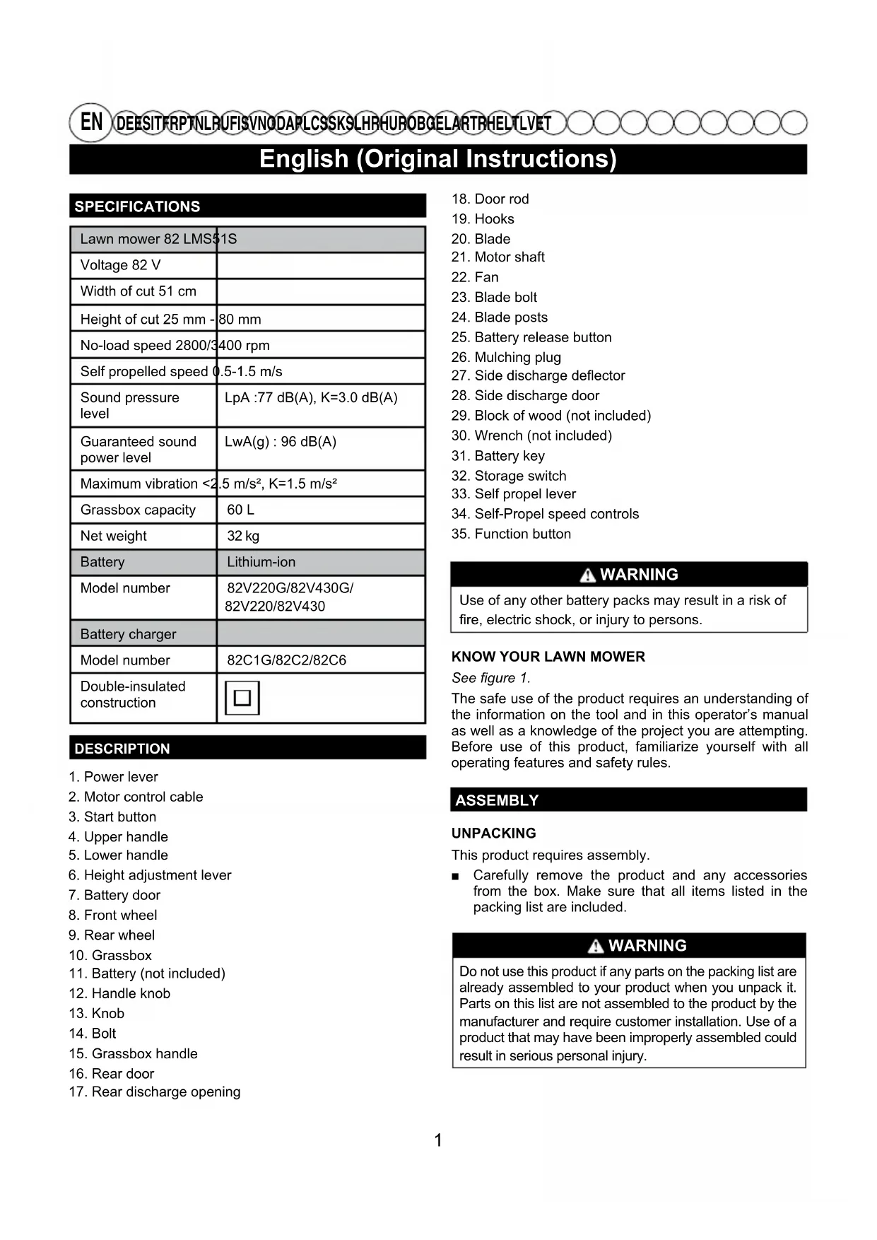 DE ES IT FR PT NL RU FI SV NO DA PL CS SK SL HR HU RO BG EL AR TR HE LT LV ET SPECIFICATIONSLawn mower 82 LMS51SVoltage 82 VWidth of cut 51 cmHeight of cut 25 mm - 80 mmNo-load speed 2800/3400 rpmSelf propelled speed 0.5-1.5 m/sSound pressure levelLpA :77 dB(A), K=3.0 dB(A)Guaranteed sound power levelLwA(g) : 96 dB(A)Maximum vibration <2.5 m/s², K=1.5 m/s²Grassbox capacity 60 LNet weight 32 kgBattery Lithium-ionModel number 82V220G/82V430G/82V220/82V430Battery chargerModel number 82C1G/82C2/82C6Double-insulated constructionDESCRIPTION1. Power lever2. Motor control cable3. Start button4. Upper handle5. Lower handle6. Height adjustment lever7. Battery door8. Front wheel9. Rear wheel10. Grassbox11. Battery (not included)12. Handle knob13. Knob14. Bolt15. Grassbox handle16. Rear door17. Rear discharge opening18. Door rod19. Hooks20. Blade21. Motor shaft22. Fan23. Blade bolt24. Blade posts25. Battery release button26. Mulching plug27. Side discharge deflector28. Side discharge door29. Block of wood (not included)30. Wrench (not included)31. Battery key32. Storage switch33. Self propel lever 34. Self-Propel speed controls35. Function button WARNING Use of any other battery packs may result in a risk ofre, electric shock, or injury to persons. KNOW YOUR LAWN MOWERSee gure 1.The safe use of the product requires an understanding of the information on the tool and in this operator’s manual as well as a knowledge of the project you are attempting. Before use of this product, familiarize yourself with all operating features and safety rules.ASSEMBLYUNPACKINGThis product requires assembly. ■ Carefully remove the product and any accessories from the box. Make sure that all items listed in the packing list are included. WARNING Do not use this product if any parts on the packing list are already assembled to your product when you unpack it. Parts on this list are not assembled to the product by the manufacturer and require customer installation. Use of a product that may have been improperly assembled could result in serious personal injury. 1English (Original Instructions)
