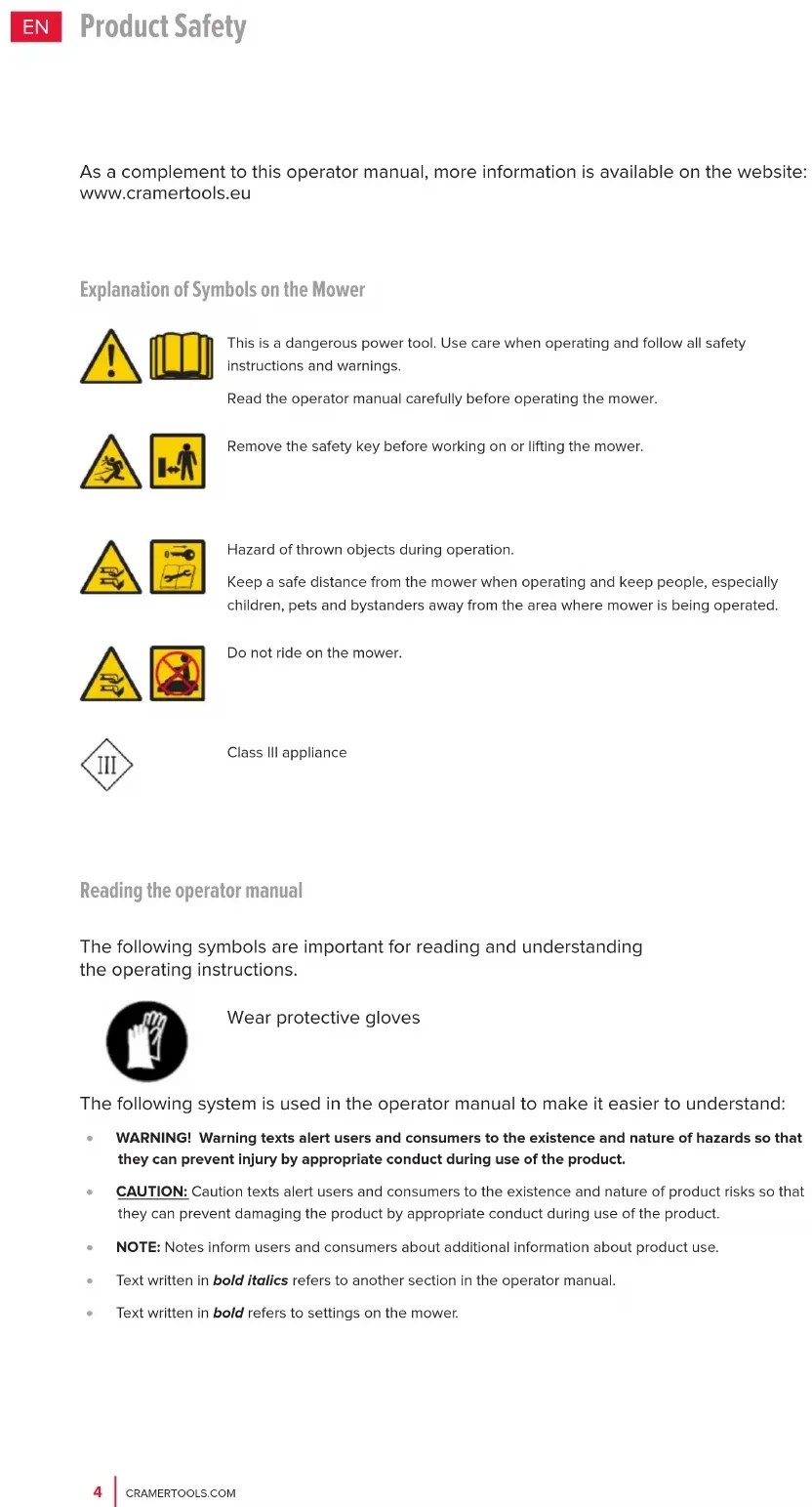 Explanation of Symbols on the Mower This is a dangerous power tool. Use care when operating and follow all safety instructions and warnings. Read the operator manual carefully before operating the mower. Remove the safety key before working on or lifting the mower. Hazard of thrown objects during operation. Keep a safe distance from the mower when operating and keep people, especially children, pets and bystanders away from the area where mower is being operated. Do not ride on the mower. Class III appliance As a complement to this operator manual, more information is available on the website: www.cramertools.eu Reading the operator manual The following symbols are important for reading and understanding the operating instructions. Wear protective gloves The following system is used in the operator manual to make it easier to understand: