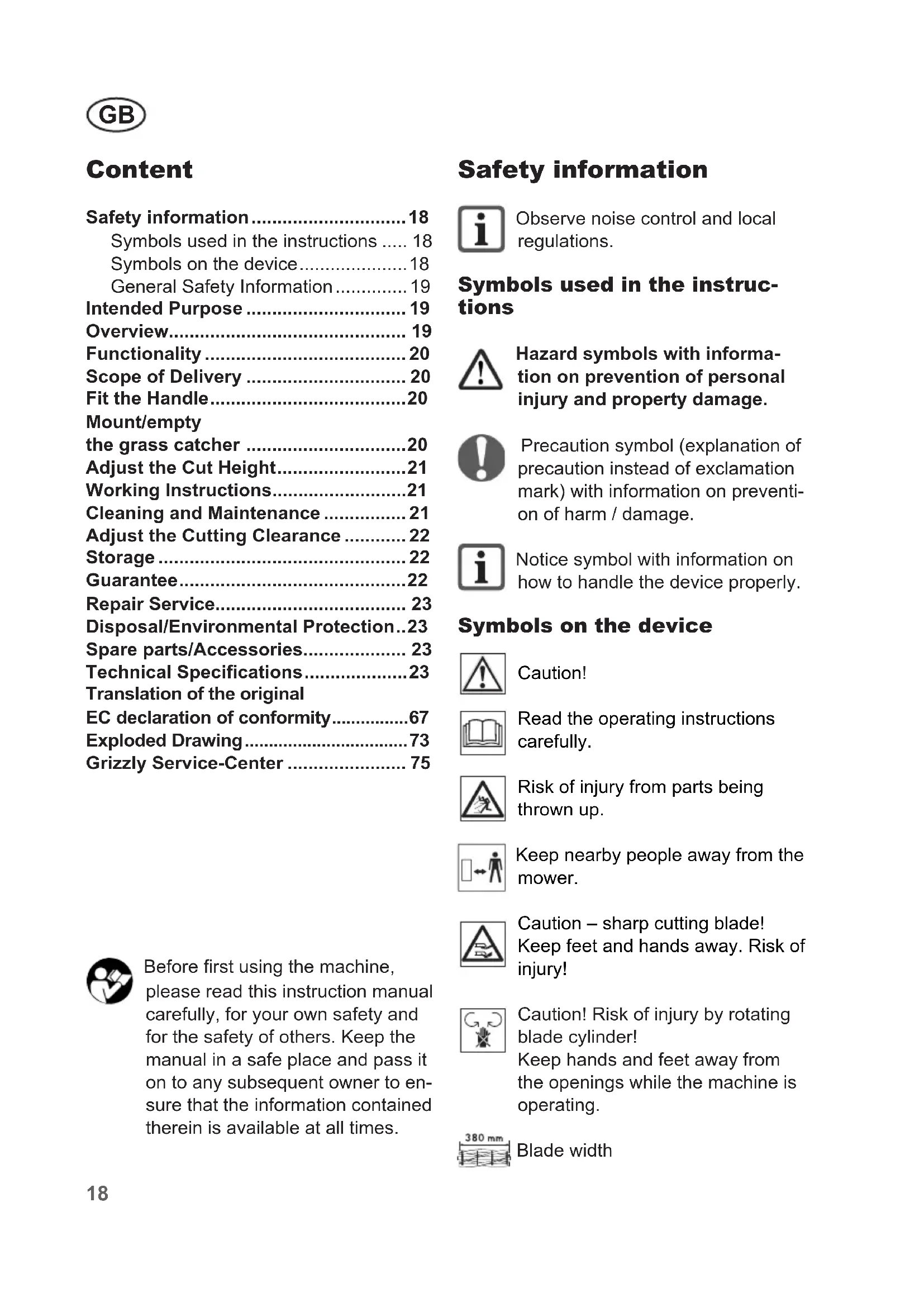 - Safety information Observe noise control and local regulations. Symbols used in the instruc- tions Hazard symbols with informa- tion on prevention of personal injury and property damage. Precaution symbol (explanation of precaution instead of exclamation mark) with information on preventi- on of harm / damage. Notice symbol with information on how to handle the device properly. Symbols on the device Caution! Read the operating instructions carefully. Risk of injury from parts being thrown up. Keep nearby people away from the mower. Caution – sharp cutting blade! Keep feet and hands away. Risk of injury! Caution! Risk of injury by rotating blade cylinder! Keep hands and feet away from the openings while the machine is operating. Blade width Translation of the original EC declaration of conformity p. 67